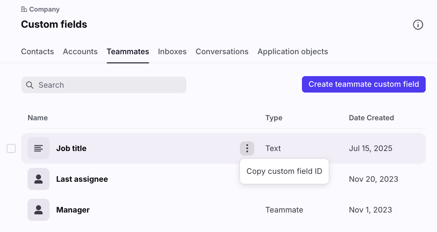 Hover over the custom field you wish to sync, and click on three-dot menu. Click Copy custom field ID.