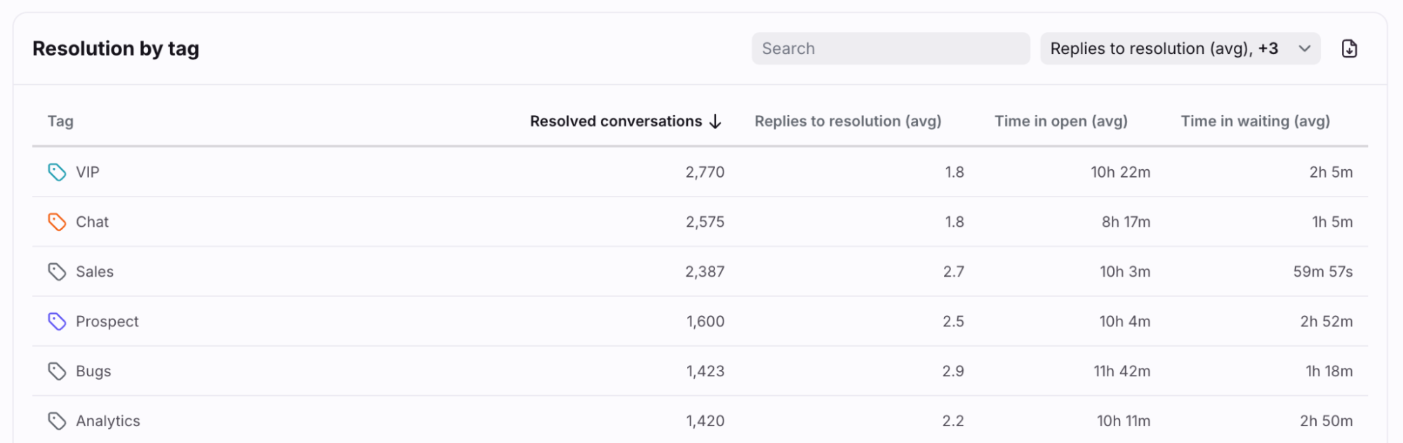 The Resolution report is the go-to place to measure how efficient your processes are, helping you identify bottlenecks that lead to long customer wait times. You can track how much time conversations spend in each ticket status, and compare resolution times by tag to pinpoint areas for improvement.