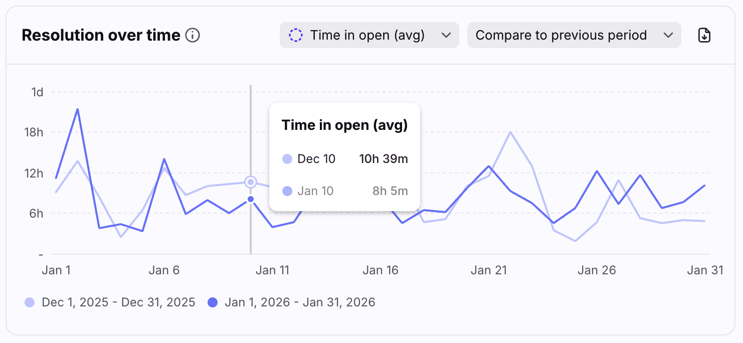 Each point represents the value of the metric during the time period on the X-axis. For reply metrics such as first reply time, this is based on the date of the reply. For resolution metrics such as time spent in status, it is based on the date of the resolution. For example, in the screenshot above, the conversations resolved on Jan 12th spent on average 8 hours in the open status.