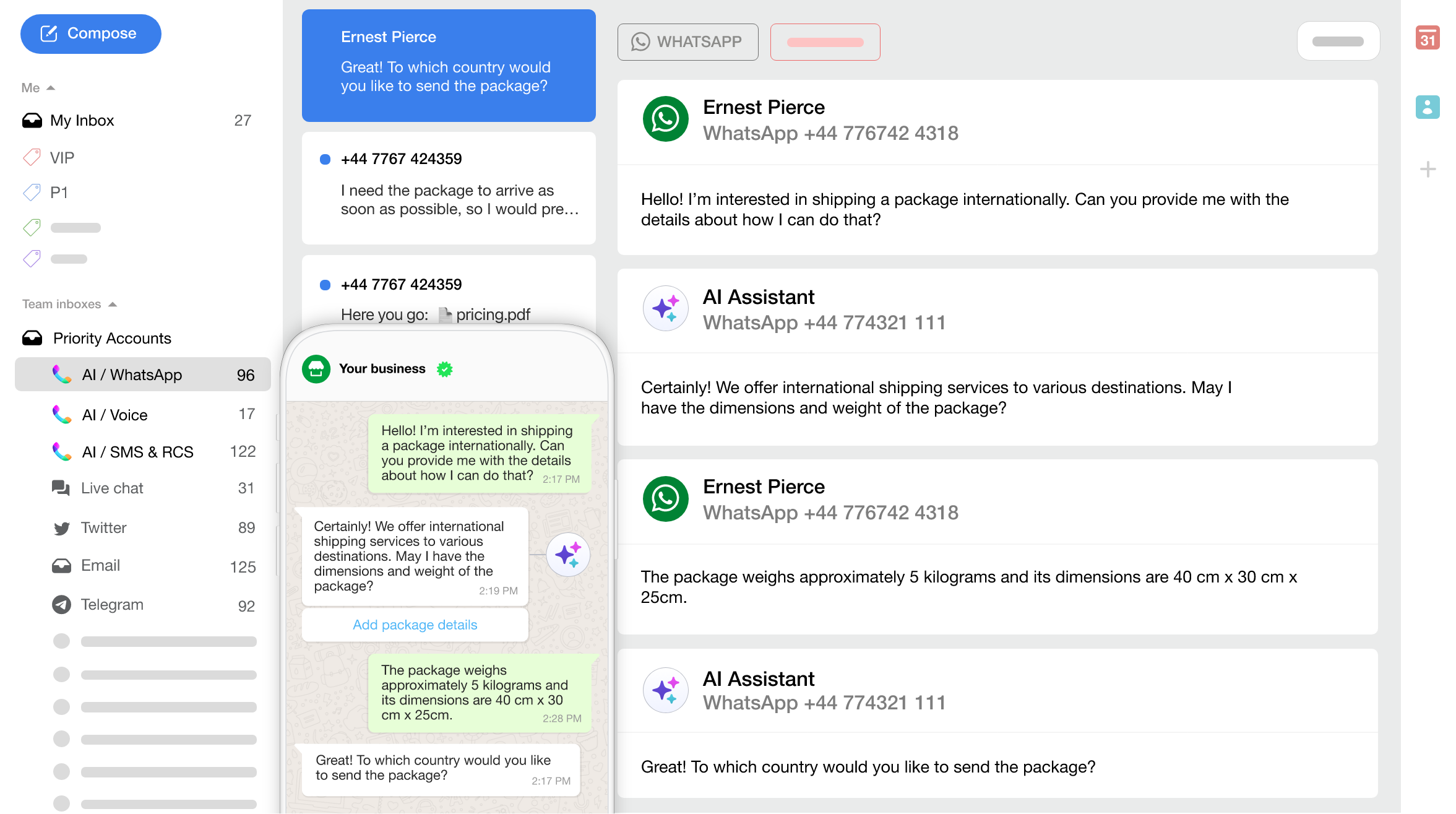 Connect WhatsApp-enabled AI Number™ with Front to: