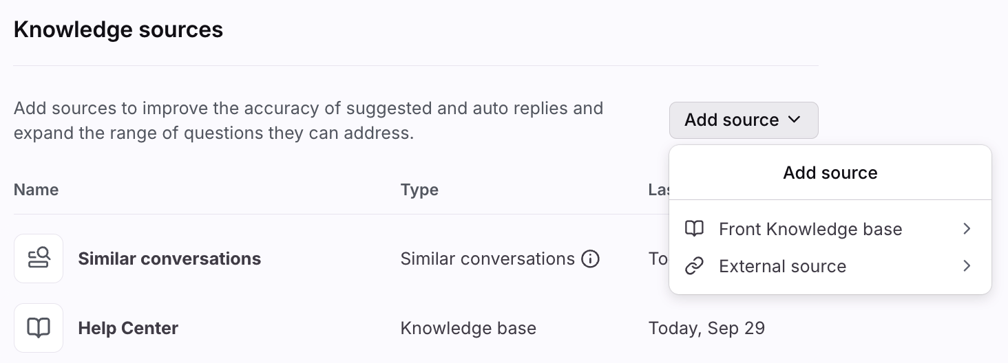 In the Knowledge sources setting, click the Add source dropdown, then select a Front knowledge base or connect an external knowledge source.
