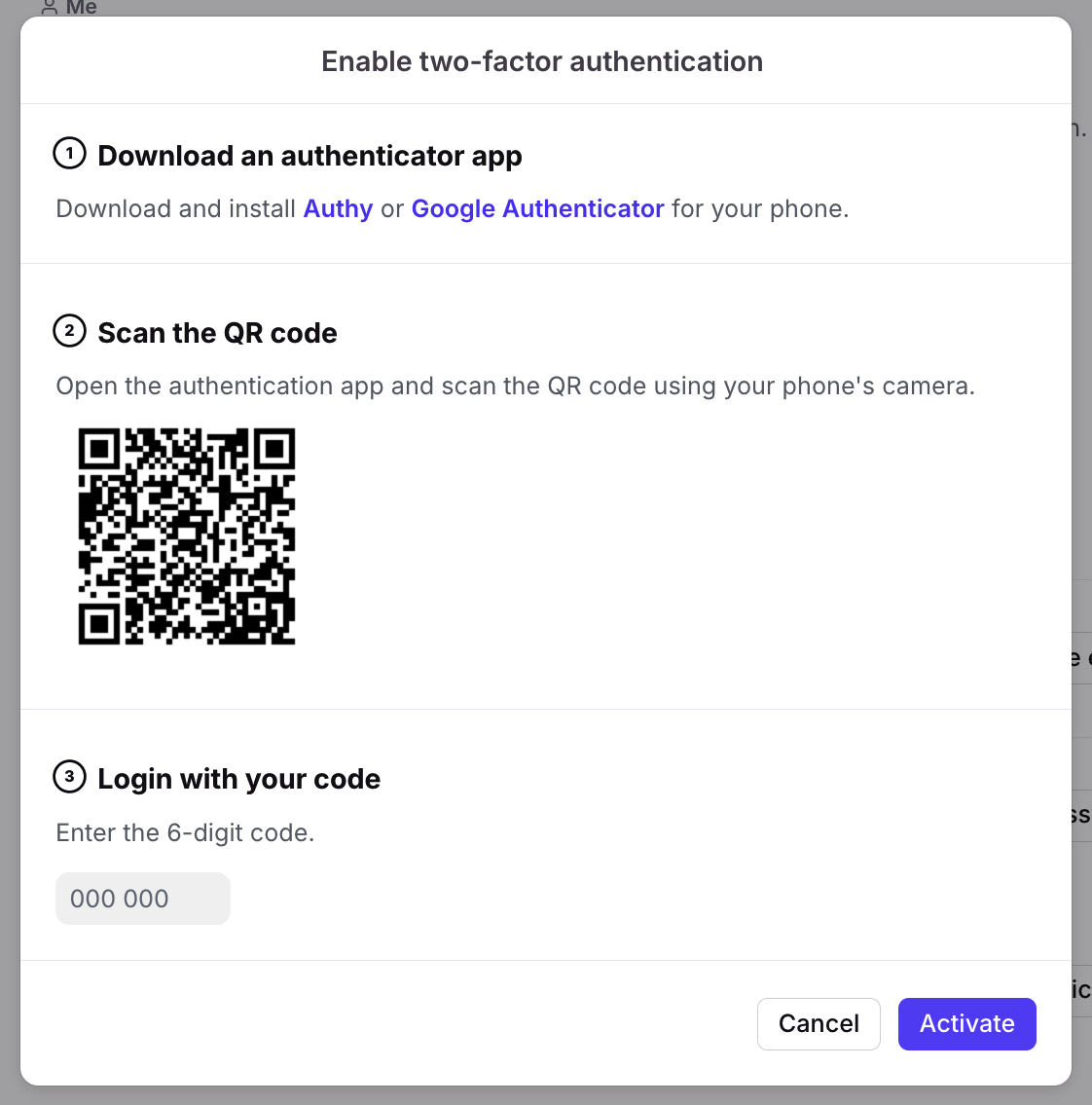 In the next pop-up, scan the QR code with your authentication app, then fill in the Login with your code field with the code generated by your app.