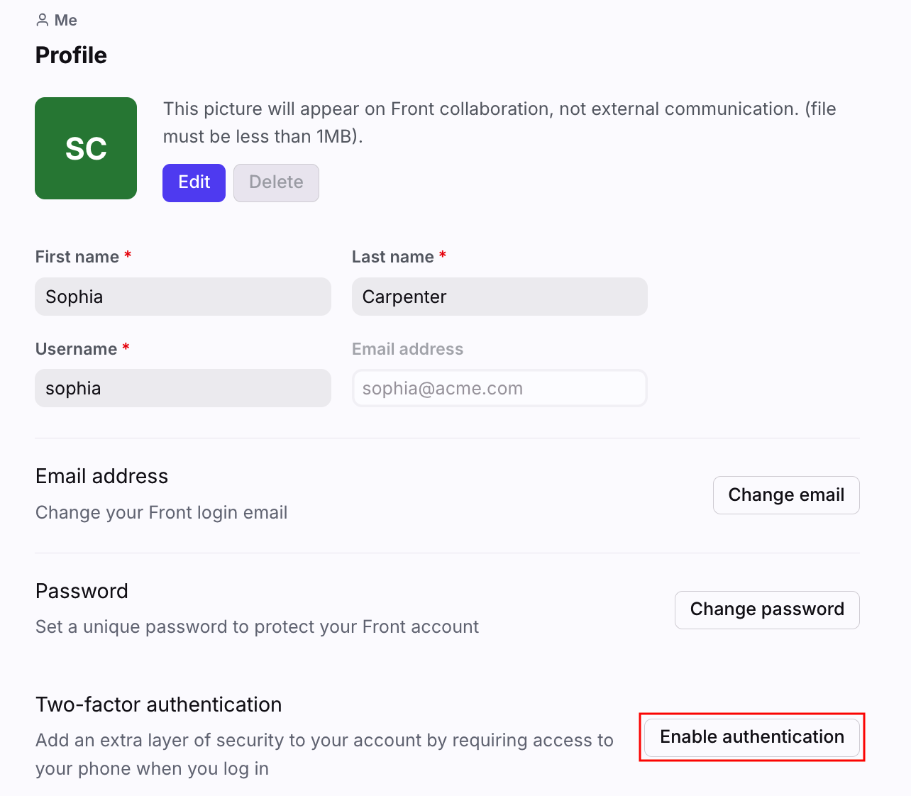 In this case, if you still wish to enable Front 2FA for your account, please reach out to our Support Team for assistance. We can disable the OAuth binding to allow you to create a Front password and enable Front 2FA.