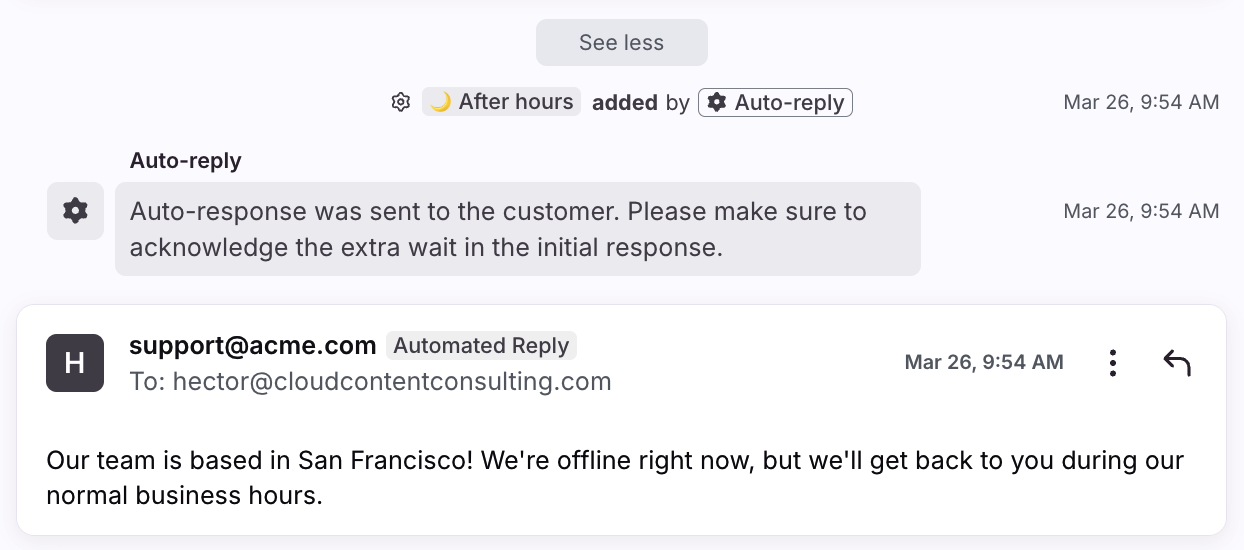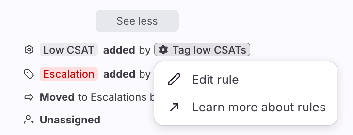 Activity history reflects actions taken by teammates, as well as automated actions performed by rules. The following activities will appear in a conversation's activity history: