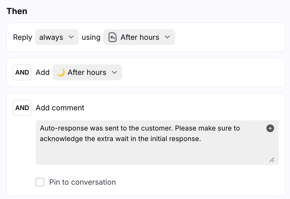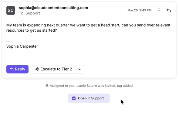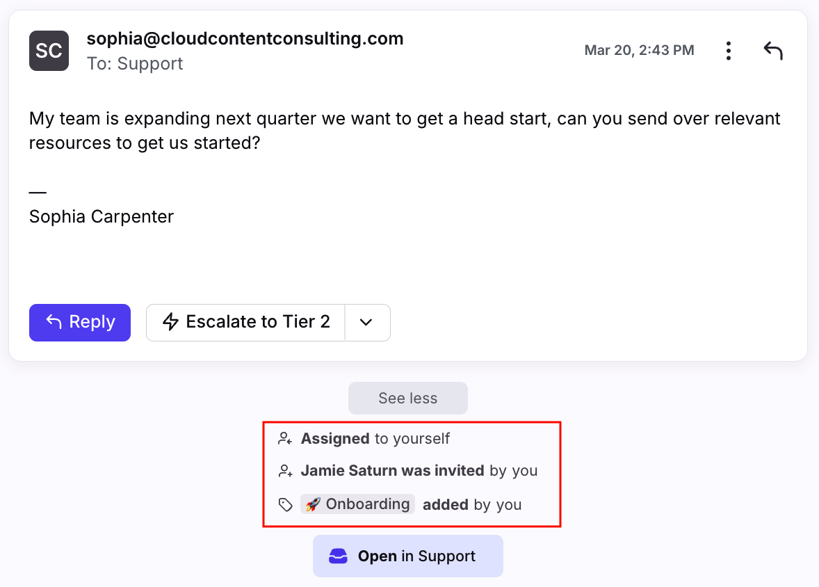 When viewing any conversation in a shared inbox, you’re able to not only read its messages and internal comments, but also see the full activity history of the conversation. The activity history lines allow you to easily reference everything that took place in a conversation, in chronological order.