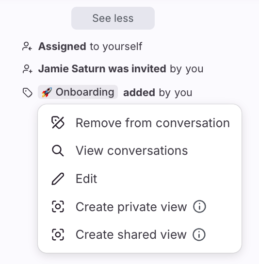 Click on a tag name in the activity history to take actions like editing the tag if you have access, view tagged conversations, and more.