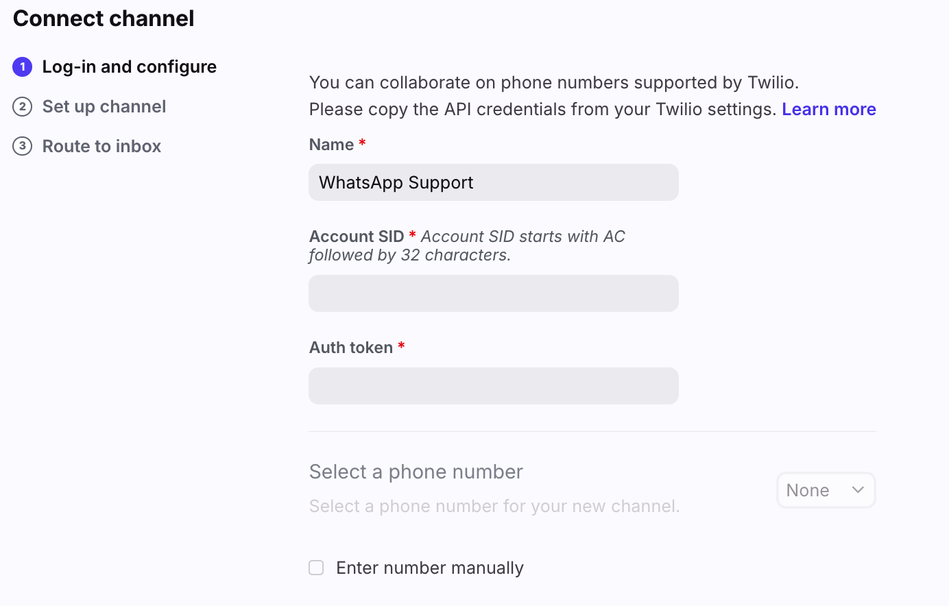 Once you've entered your Twilio account credentials, your Twilio phone numbers will automatically populate in the Select a phone number section. Select your WhatsApp number from the options.