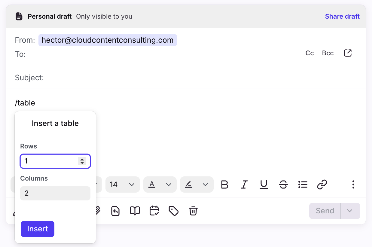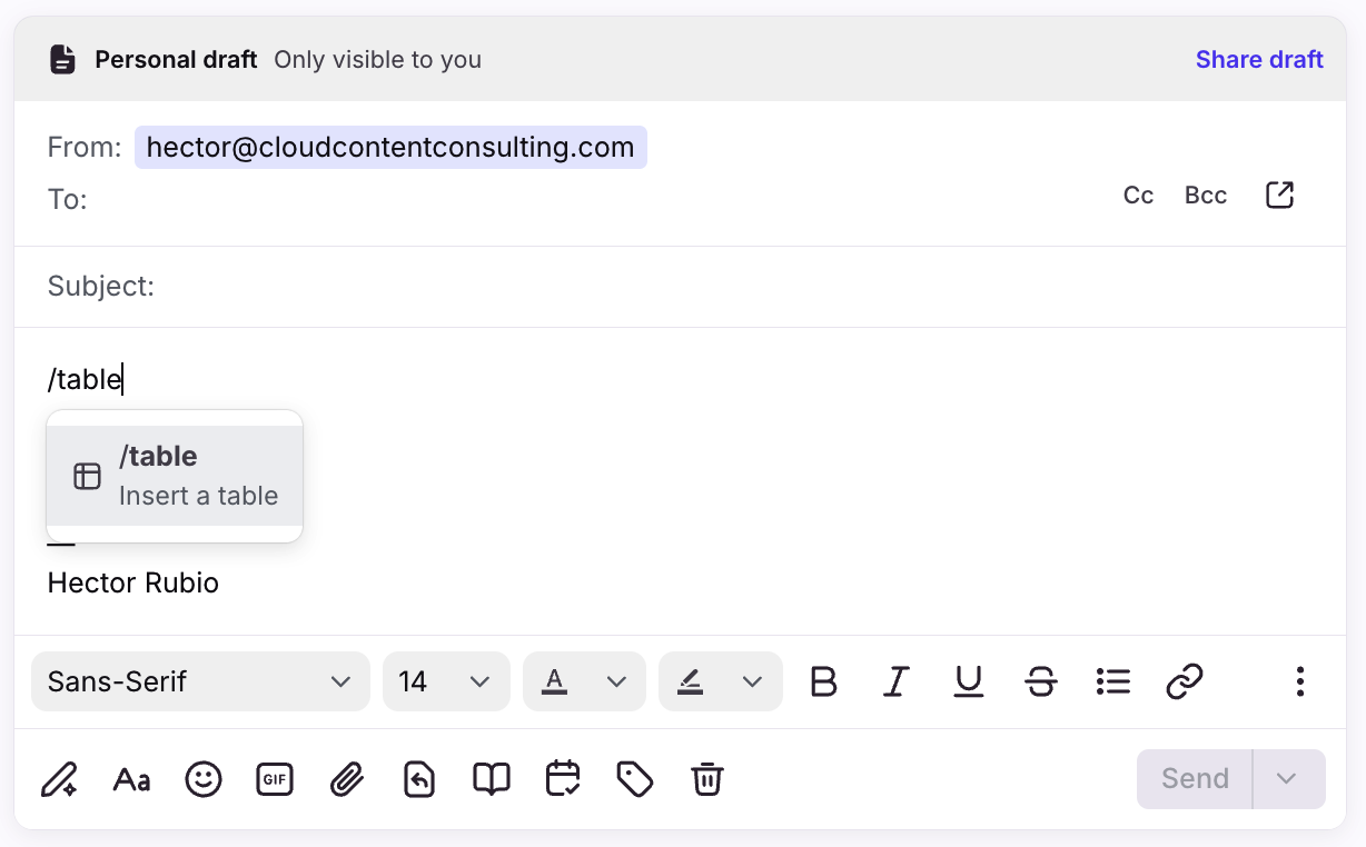 In the composer, type /table then press Enter on your keyboard or click the dropdown option.
