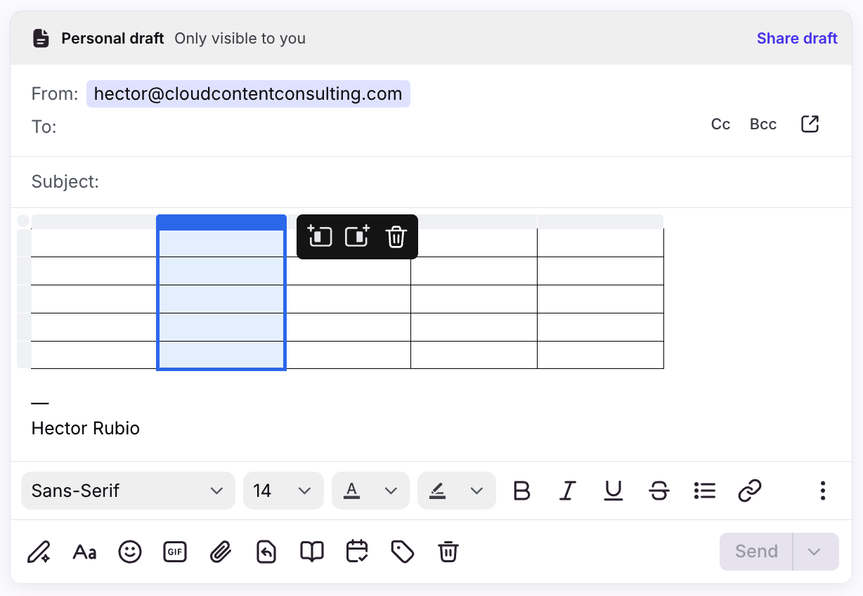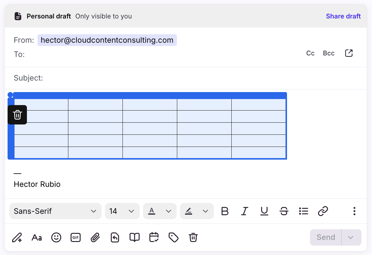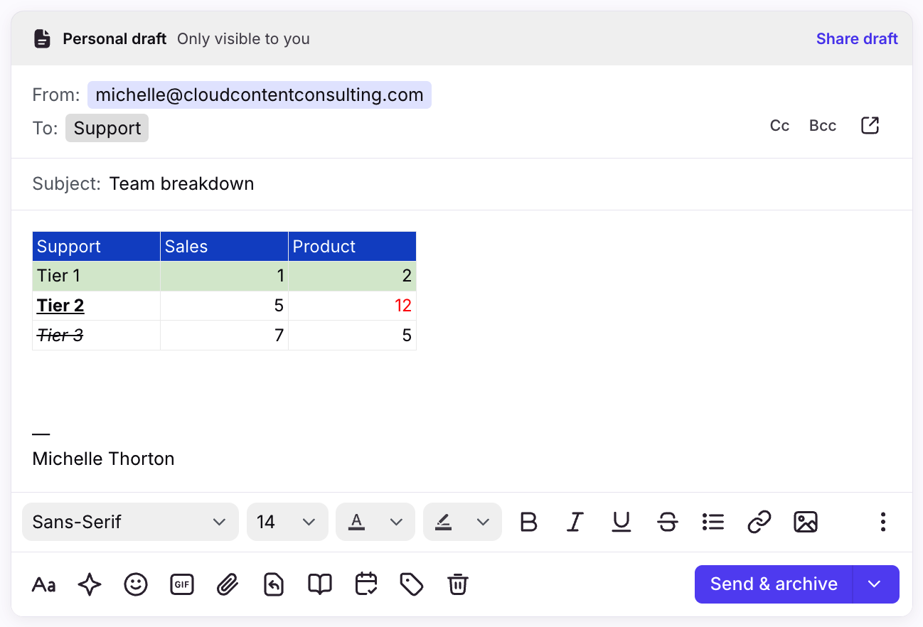 When composing a message, you may want to include tables from external sources or create them from scratch in Front. This article outlines current compatibility with imported tables and what you are able to edit in Front.