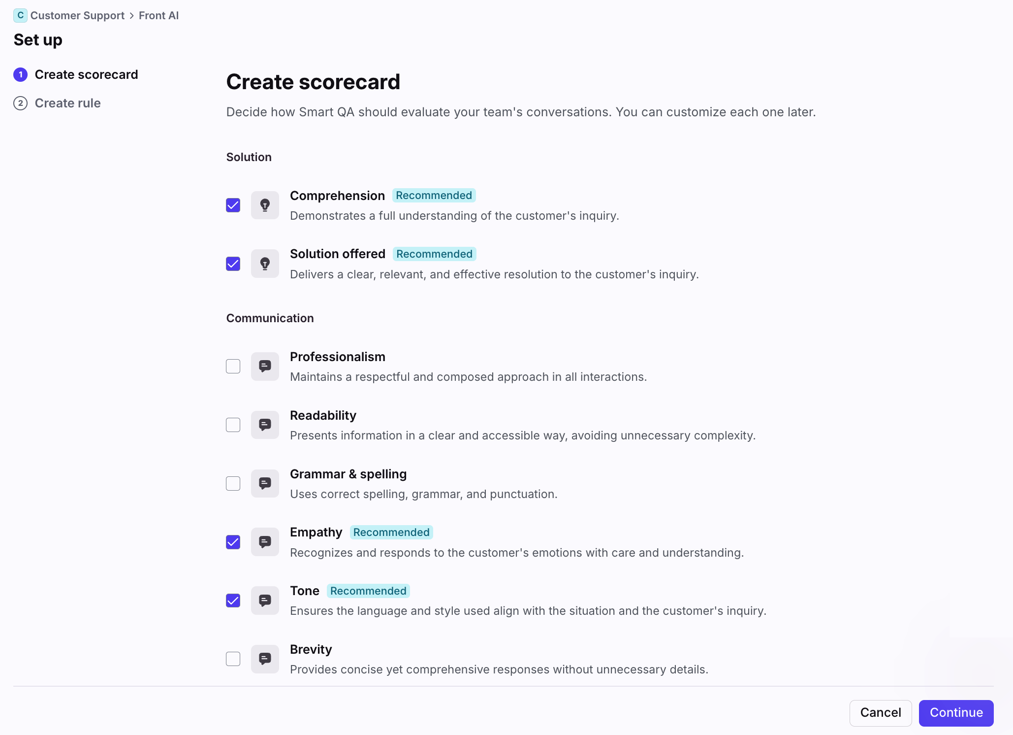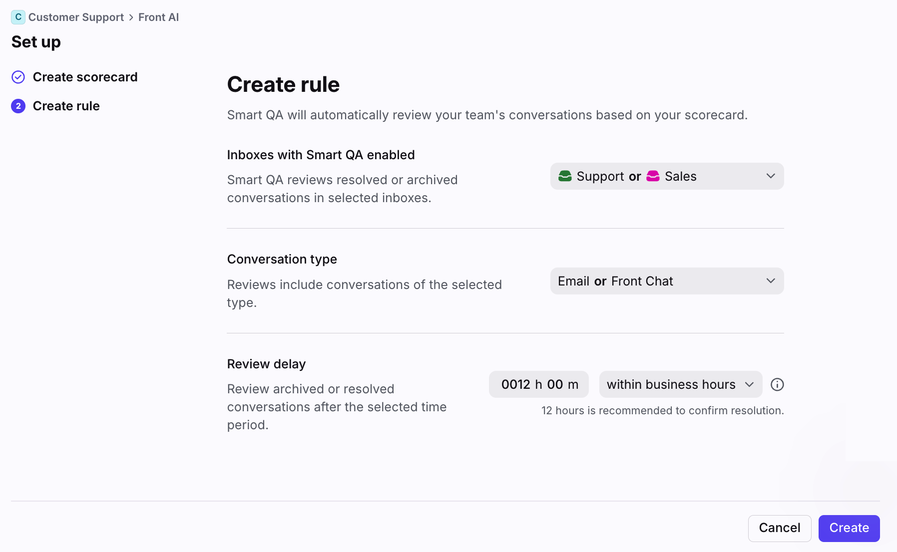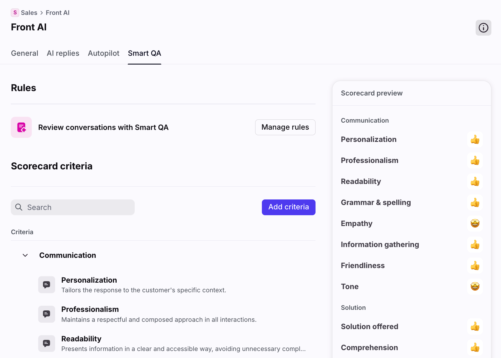 Set up scorecard criteria in the Front AI tab in workspace settings