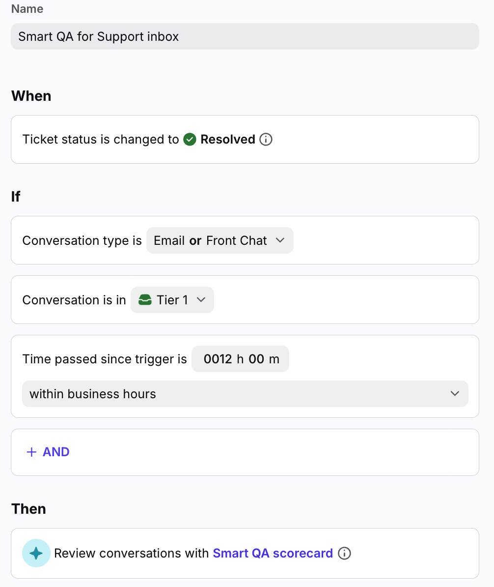 Only conversations in shared inboxes will be reviewed. Additionally, a conversation review requires at least one inbound and one outbound message and the conversation must be marked as Resolved or Archived. Admins can also set additional conditions during the rule setup.