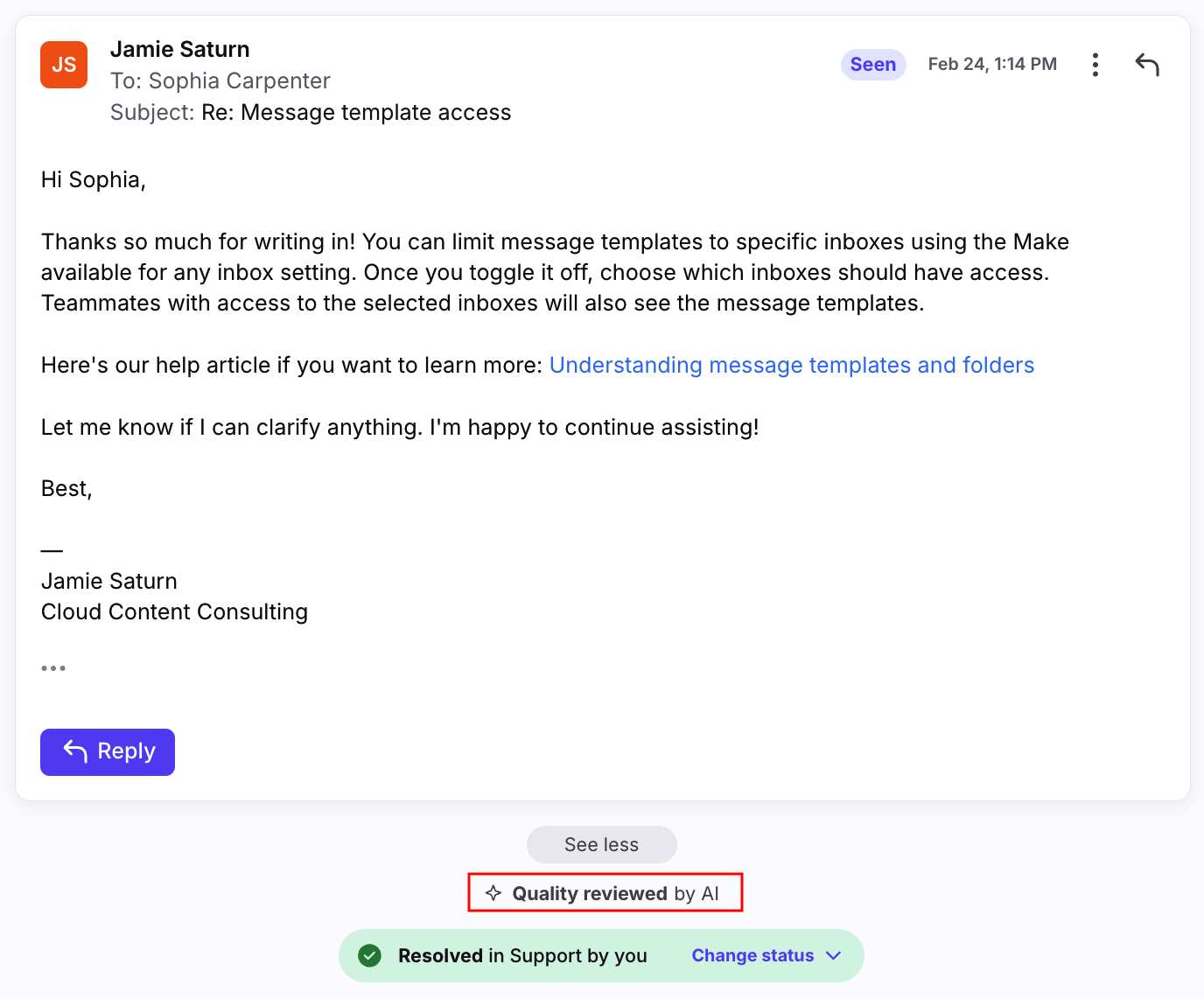 Front’s Smart QA (quality assurance) feature accelerates time-consuming manual QA processes with AI, giving support leaders a complete view of agent performance, without the need for manual ticket-by-ticket reviews. Configure your scorecard to automatically score the selected criteria, and display them in the plugin panel for email conversations.