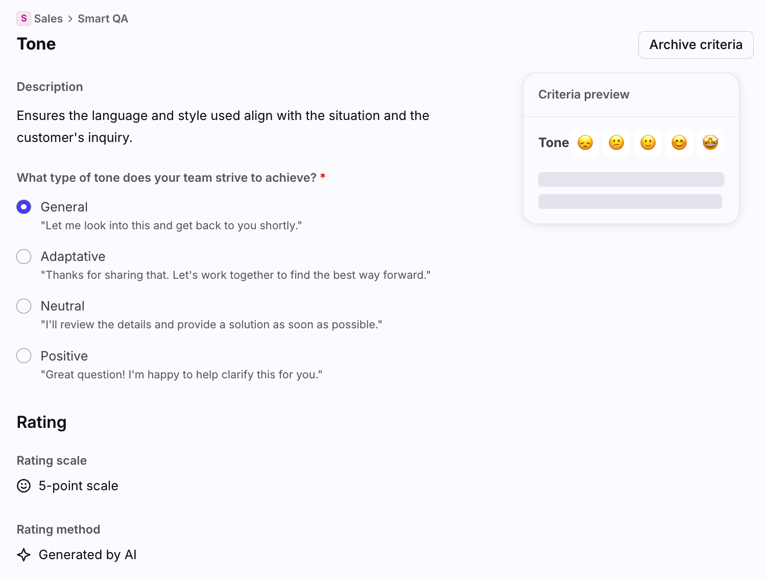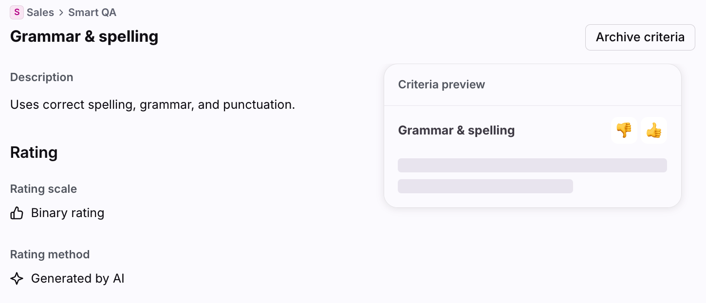 Smart QA has two rating scales to score criteria, a range (1-5) and binary (0 or 1).