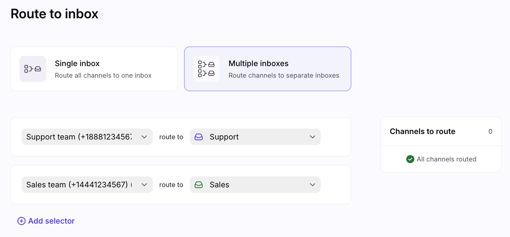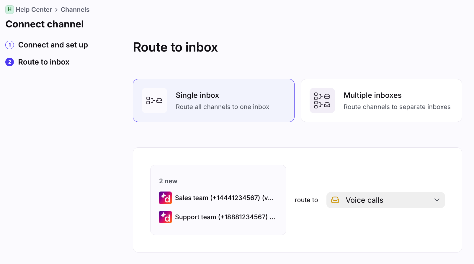 In the Route to inbox page, select whether you want to route the channel(s) to a single inbox, or multiple inboxes.