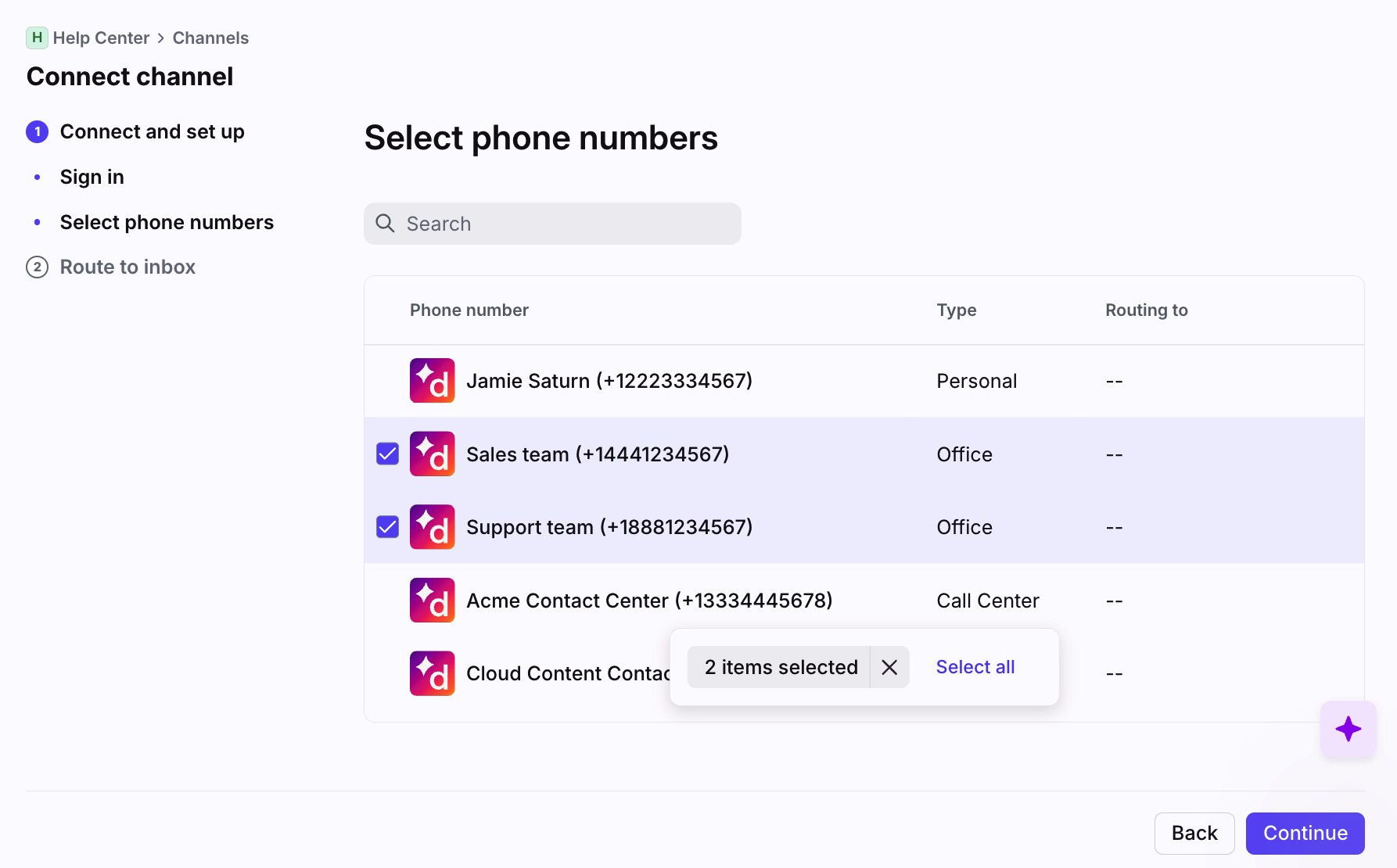 Select the phone number you want to connect to Front. Select multiple channels to connect them in bulk.