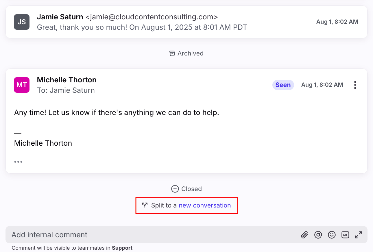 After a conversation or ticket is resolved and no further action is needed, you can permanently mark it as closed. This makes it easier for teams to lock old threads to maintain a clean and organized conversation history. When a customer replies to a closed conversation, the message automatically splits into a new conversation thread, ensuring that new topics aren’t stuck in old threads.