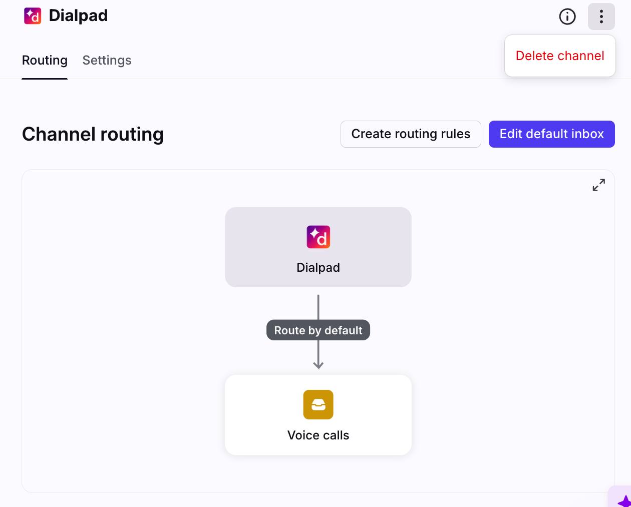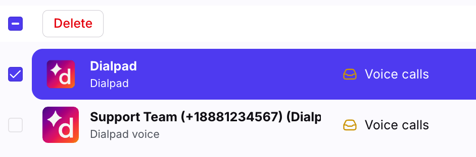 Once you’ve confirmed the new Dialpad channel works as expected, delete the legacy Dialpad channel from the inbox. Legacy channels have the sub-label "Dialpad", while new channels have the sub-label "Dialpad voice" or "Dialpad sms" in the channel list.