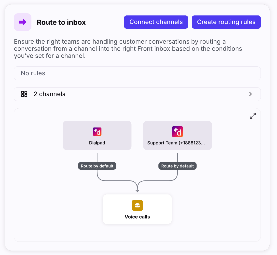 If you connect a number using the new Dialpad integration and it was already connected to Front via the legacy Dialpad channel integration, you will see the call show up as separate conversations in the inboxes that each channel is connected to. We recommend deleting the legacy Dialpad channel from the inbox to prevent duplicate conversations.