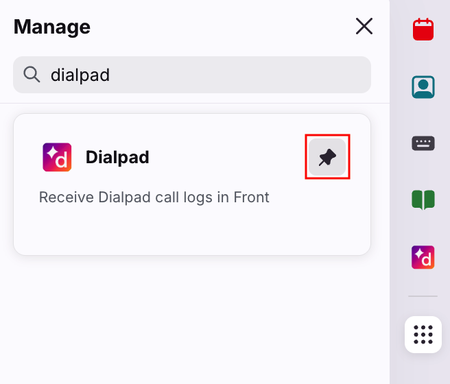 If you’re migrating from Front’s legacy Dialpad sidebar integration, we recommend unpinning the legacy Dialpad plugin from the righthand sidebar. This prevents you from getting two sets of notifications from both the legacy and new integrations.