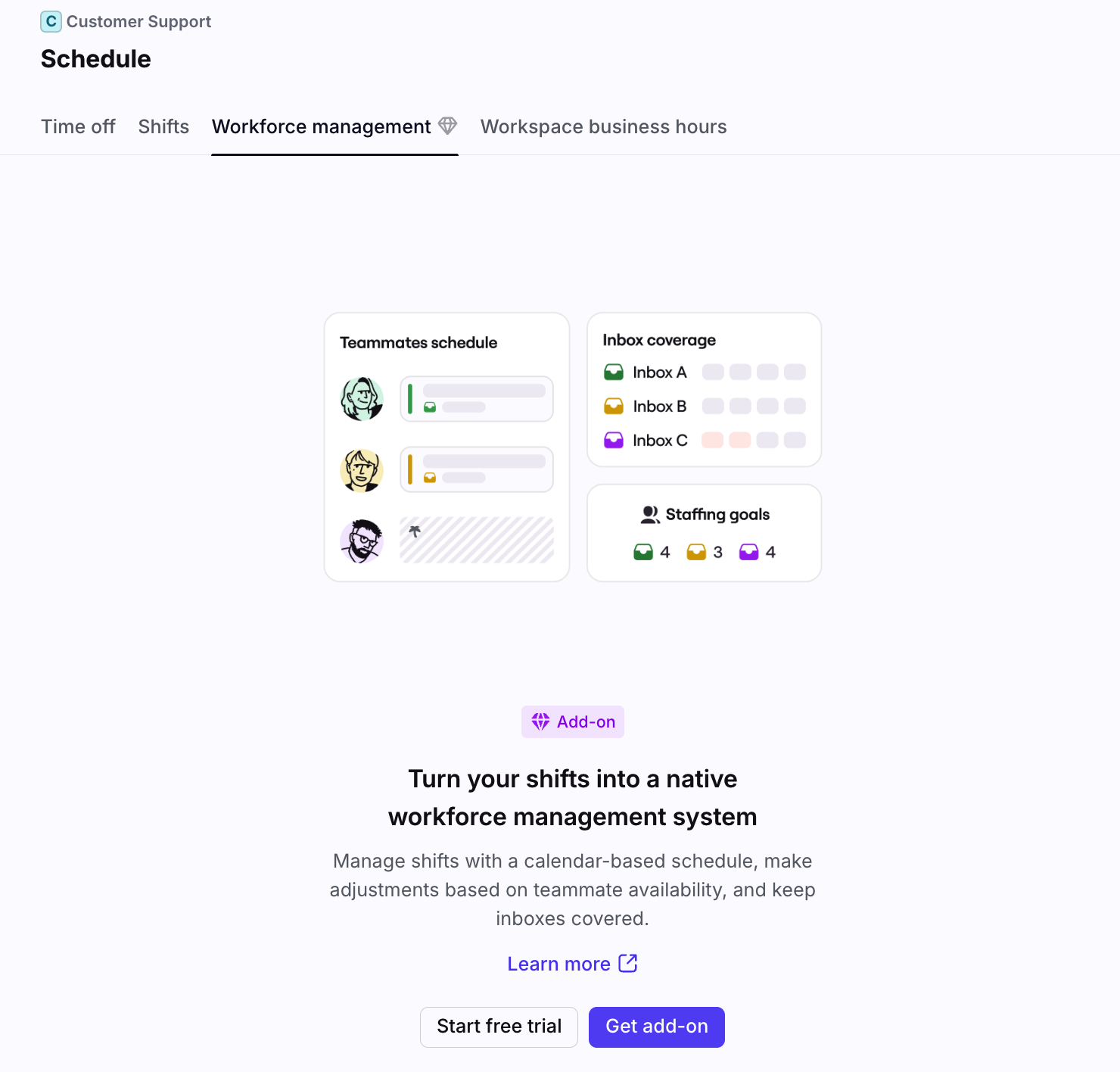 To try the Workforce Management add-on for free, click Start free trial in the Workforce management tab in the Schedule page. This will start a 30-day trial.