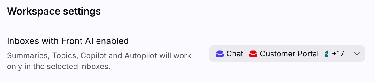 Under Workspace settings, use the dropdown in the Inboxes with Front AI enabled setting to select the shared inboxes where you want to enable Topics.