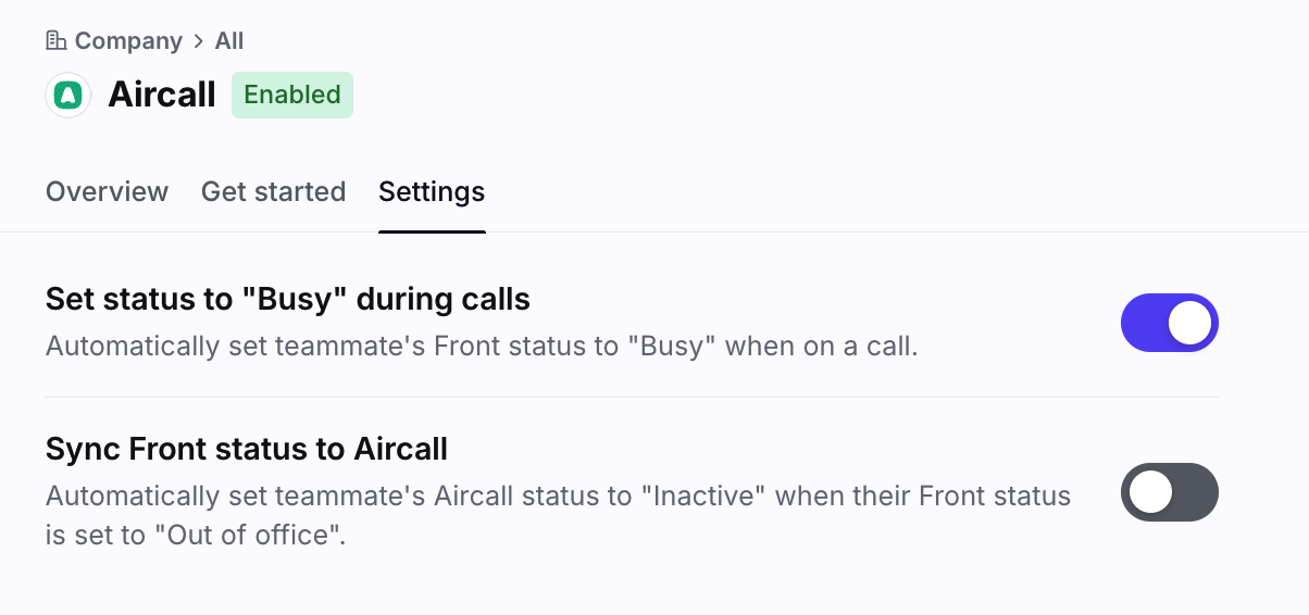 If toggled off, Front status changes will not affect Aircall statuses. e.g. Agent can be “Available” in Front and “Inactive” in Aircall.