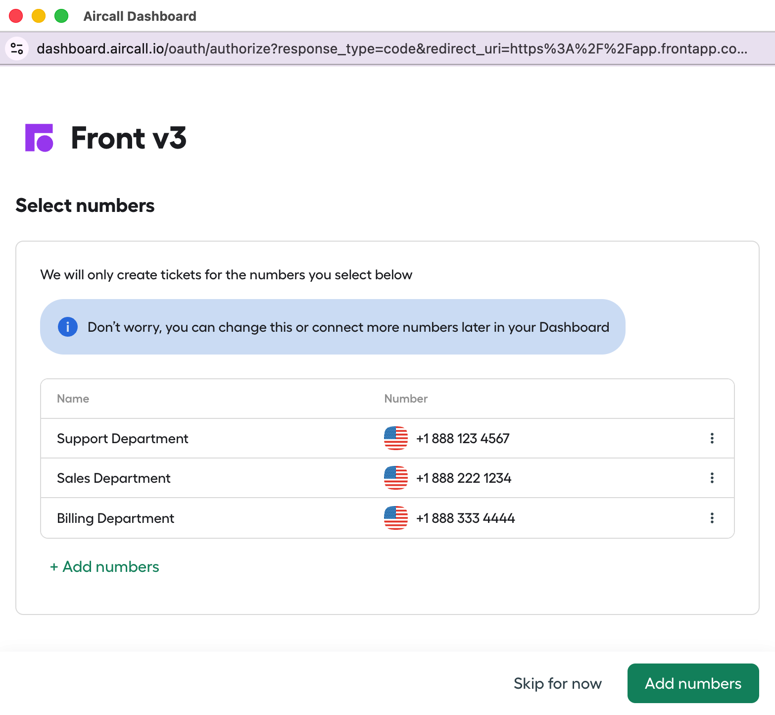 Select the numbers you’d like to add to Front, then click Add numbers. The pop-up will automatically close.