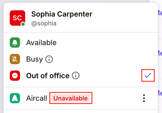 If you change your Front status between “Available” and “Out of office” in Front, your Aircall status will automatically update to match.