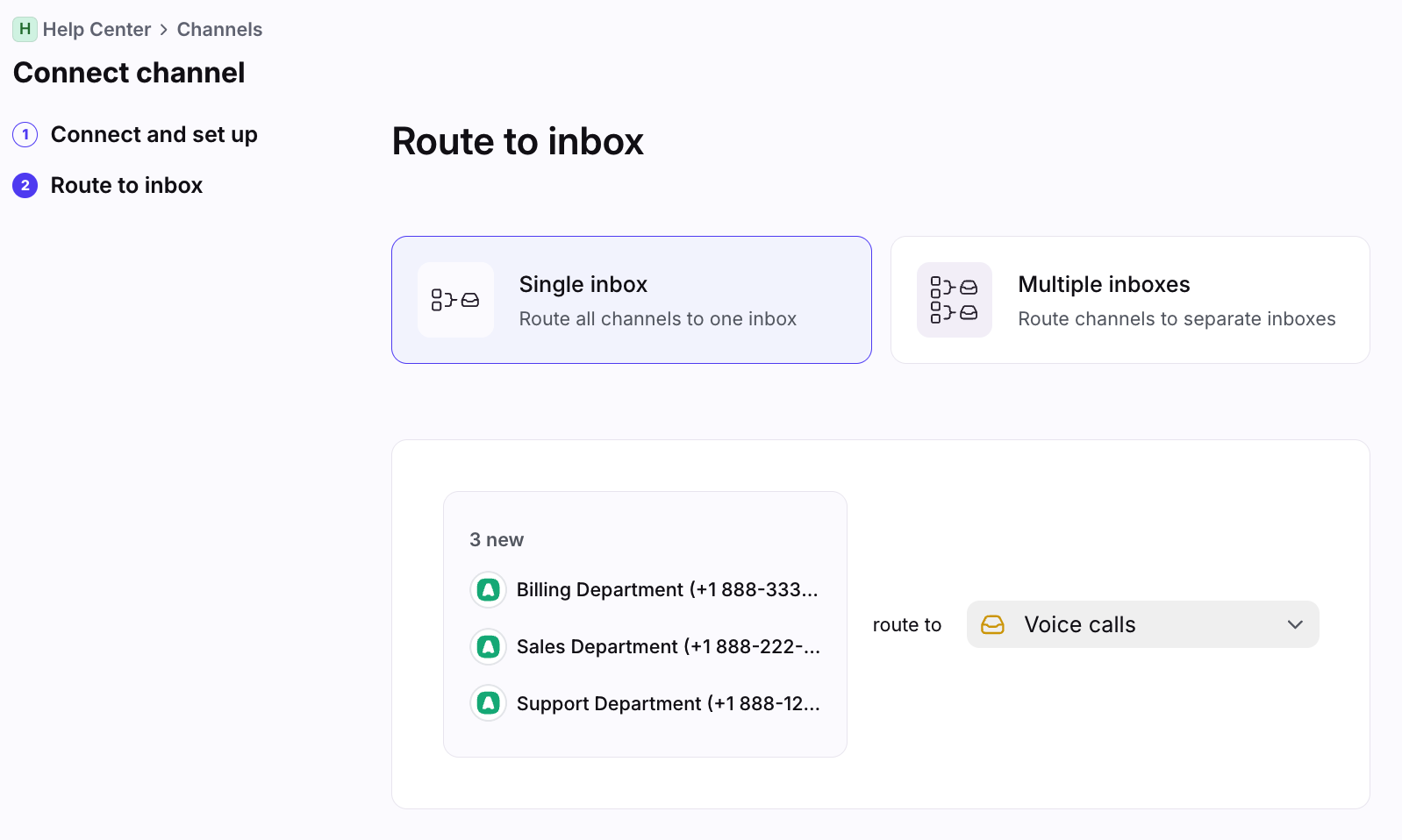 In the Route to inbox page, select whether you want to route the channel(s) to a single inbox, or multiple inboxes.
