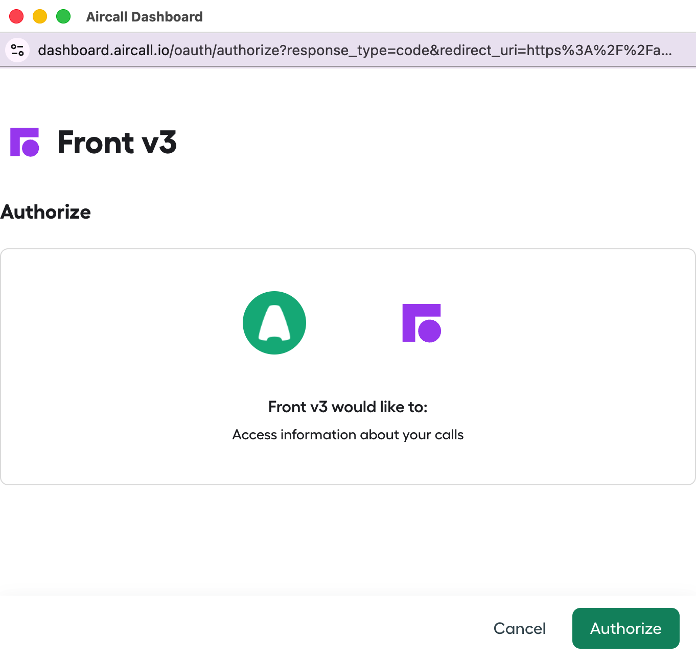Log into a Front account using the same email address you use with Aircall.