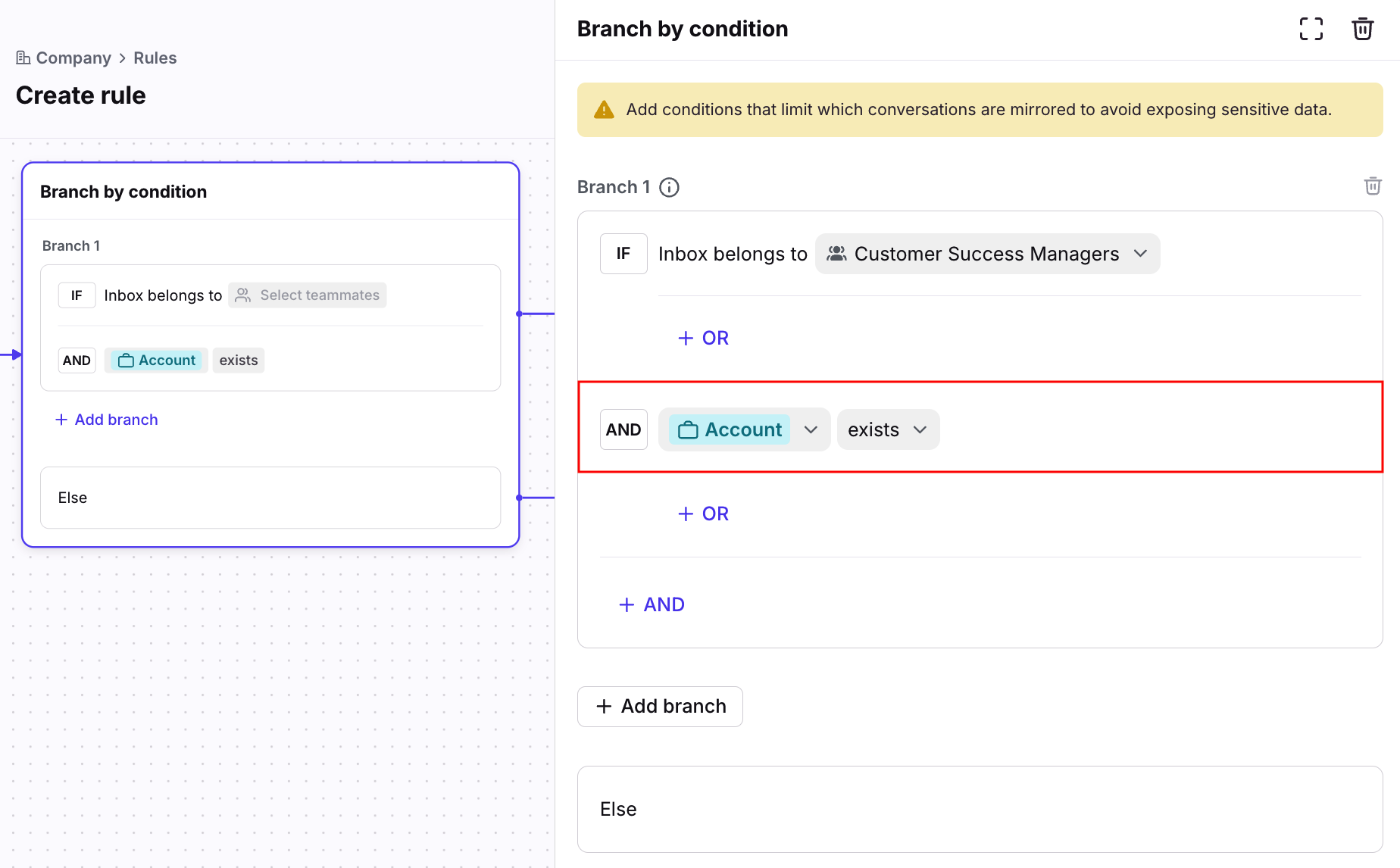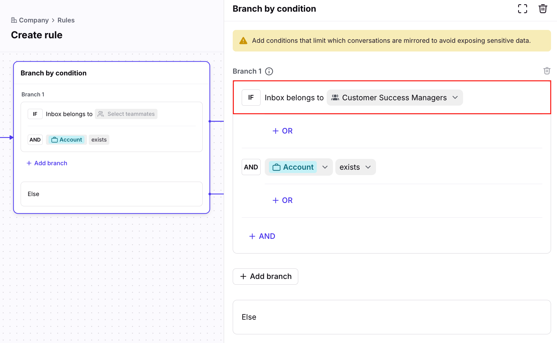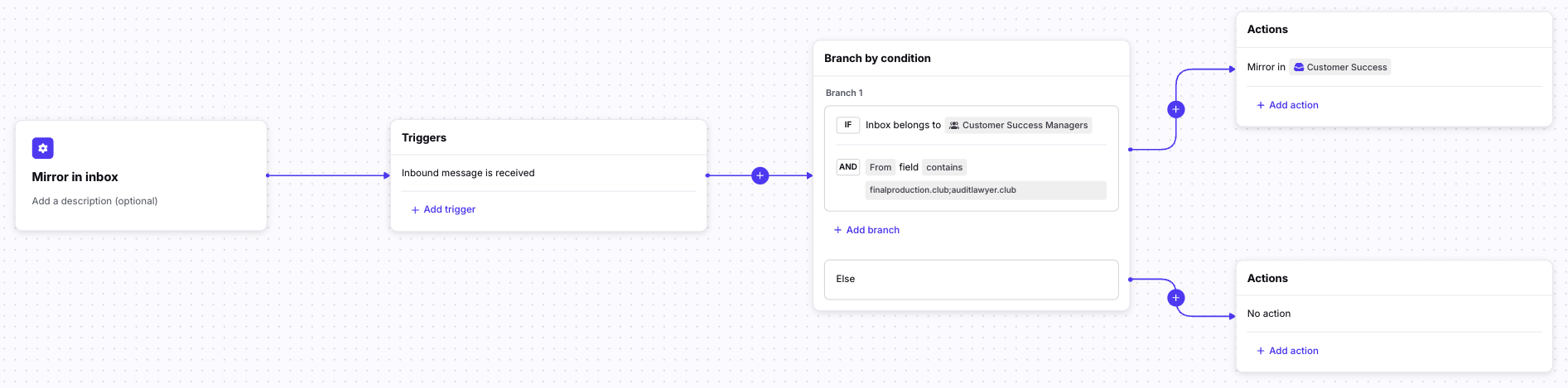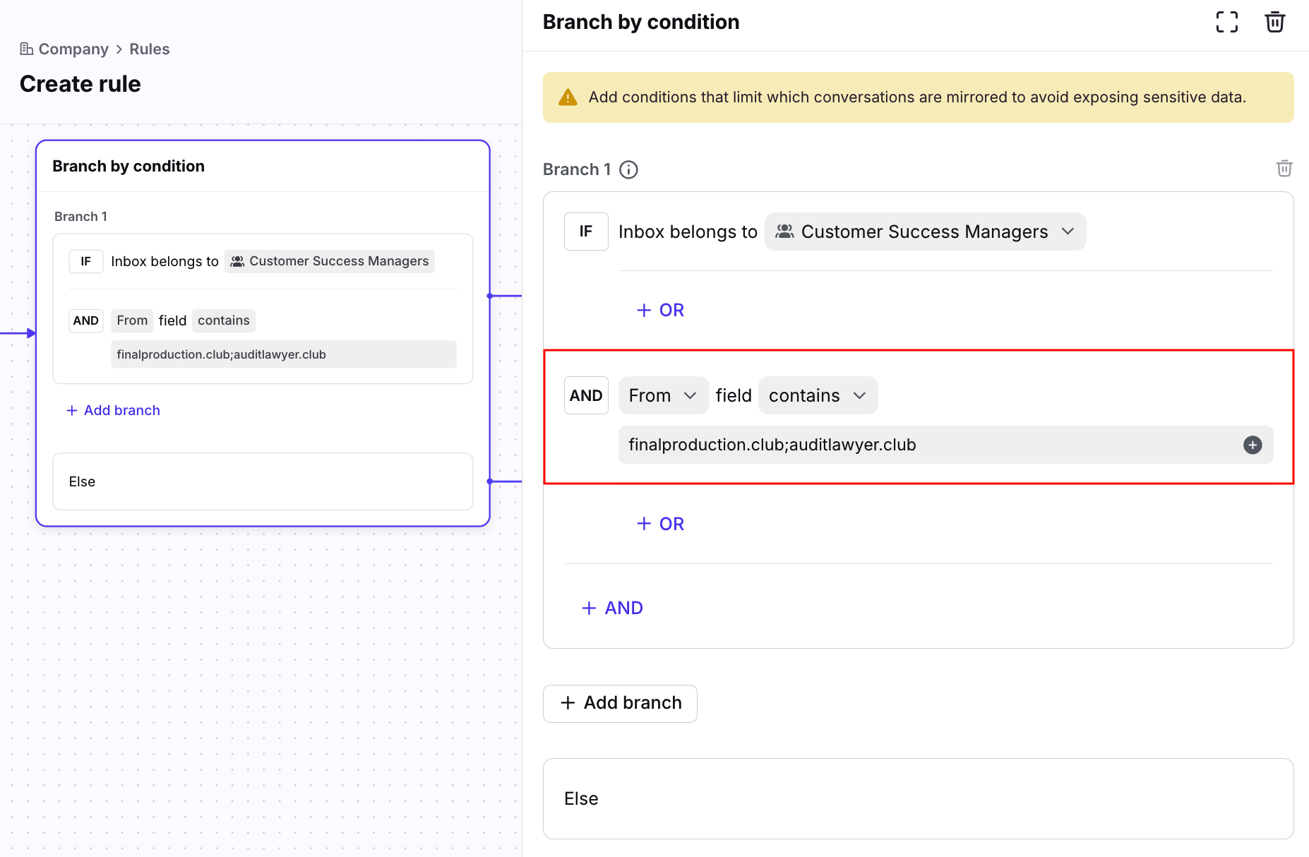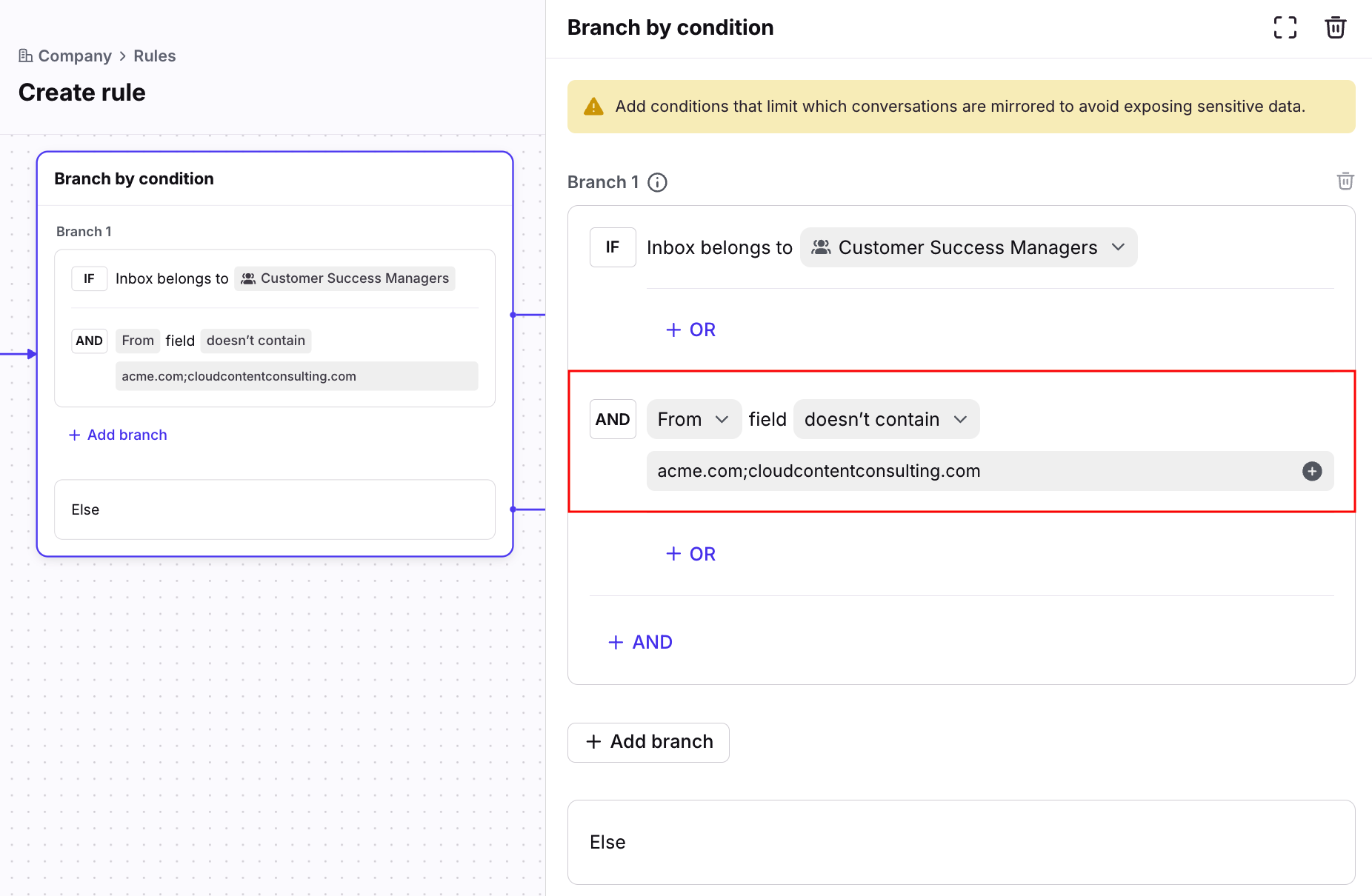 Add additional conditions to the Branch by condition step to narrow down which conversations to mirror in a shared inbox.