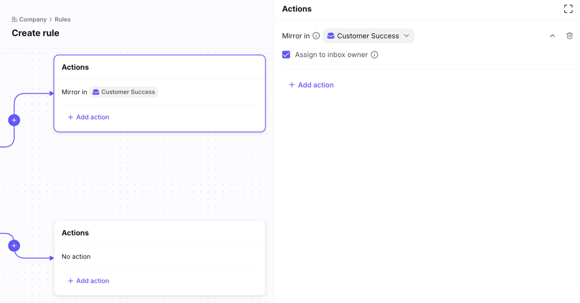 In the Actions step for Branch 1, select the inbox you’d like to mirror the conversations in. The template automatically selects the Assign to inbox owner option.