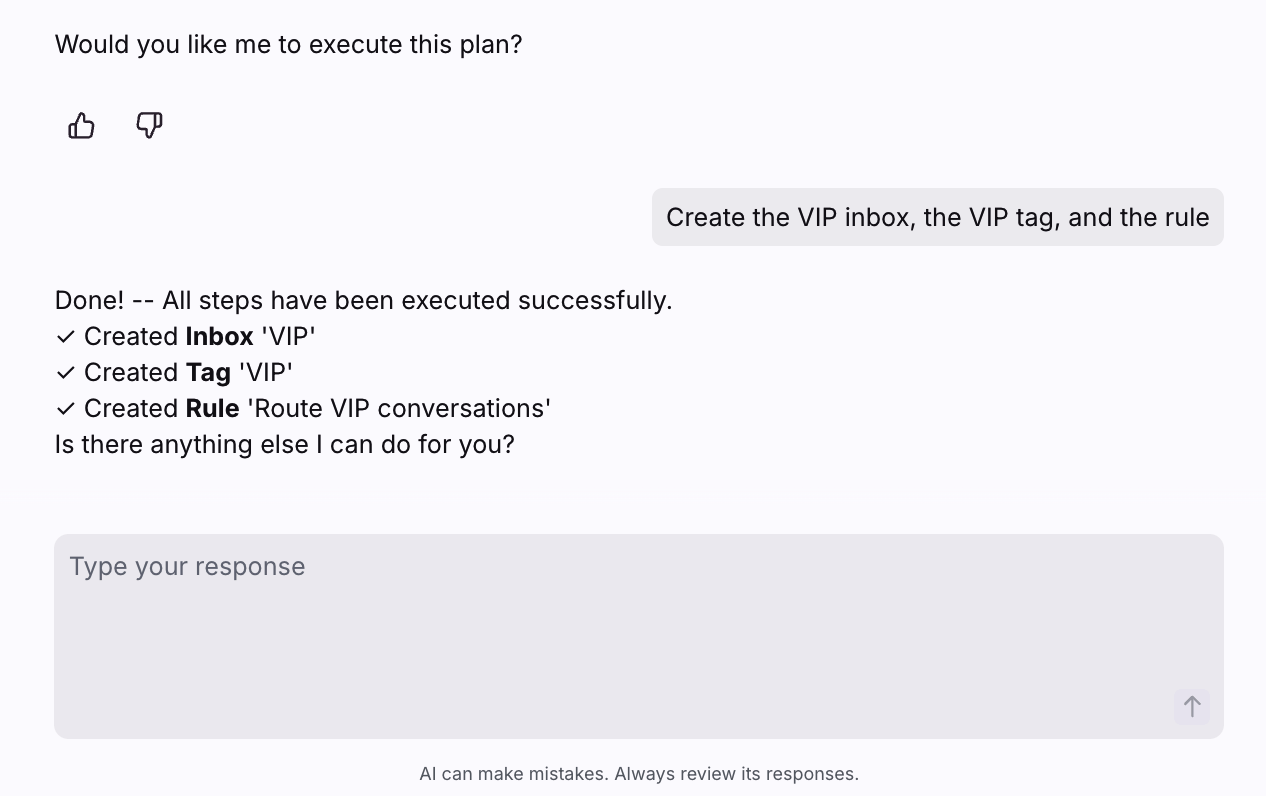 Use the text box to confirm the actions you want Admin Copilot to take. In this example, we’ll confirm that we want Admin Copilot to automatically create an inbox, tag, and rule from the suggested plan.