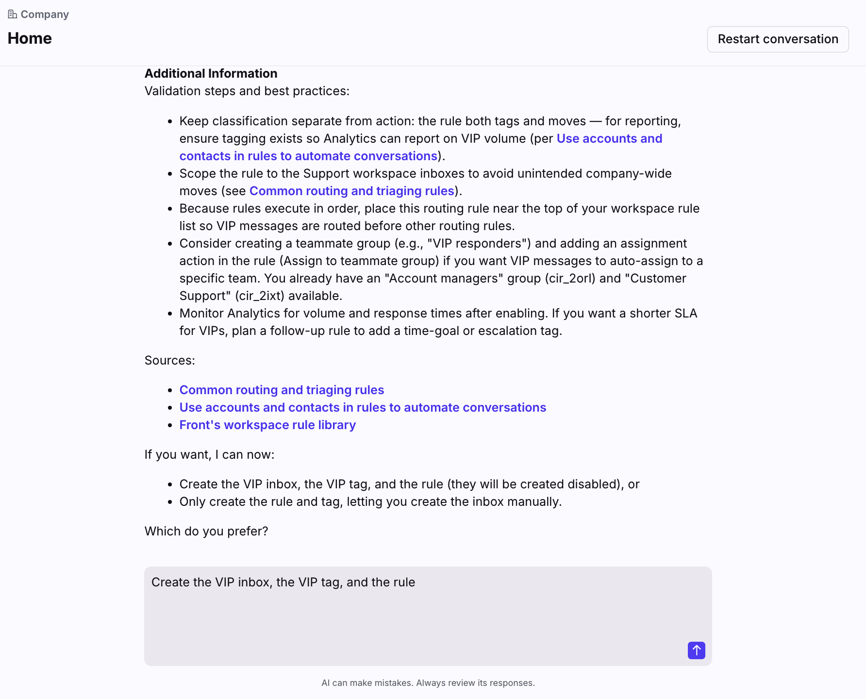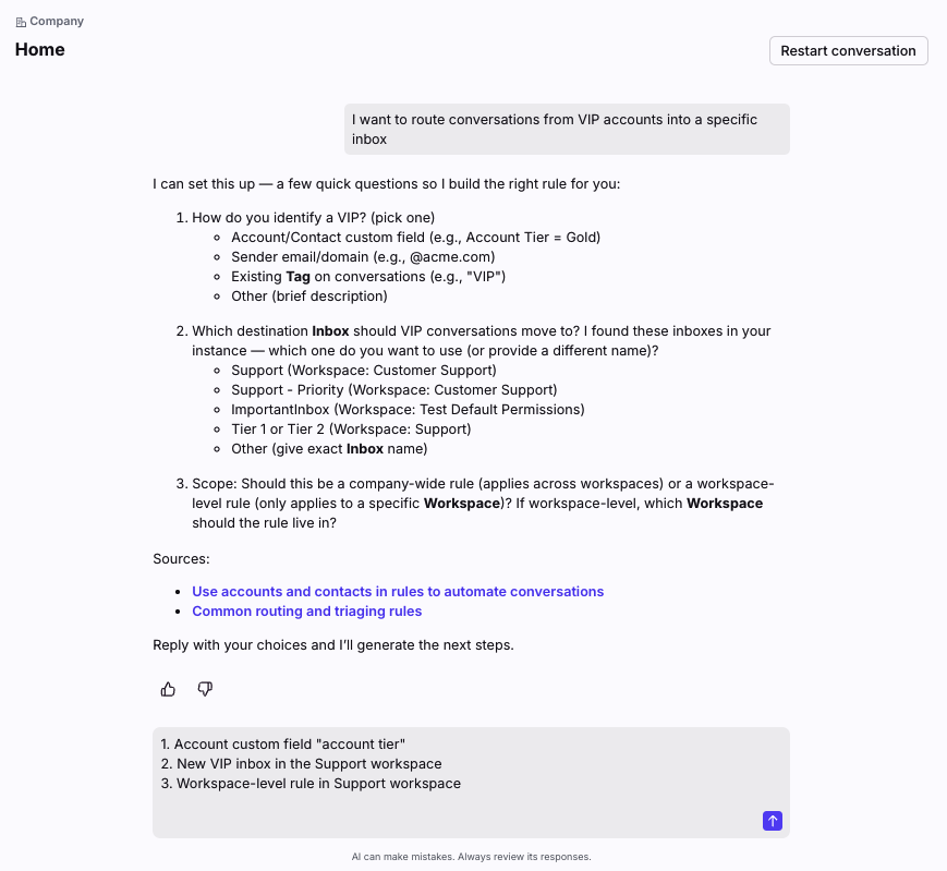 In this example, we want Admin Copilot to recommend and set up a workflow to route conversations from VIP accounts into a specific inbox.