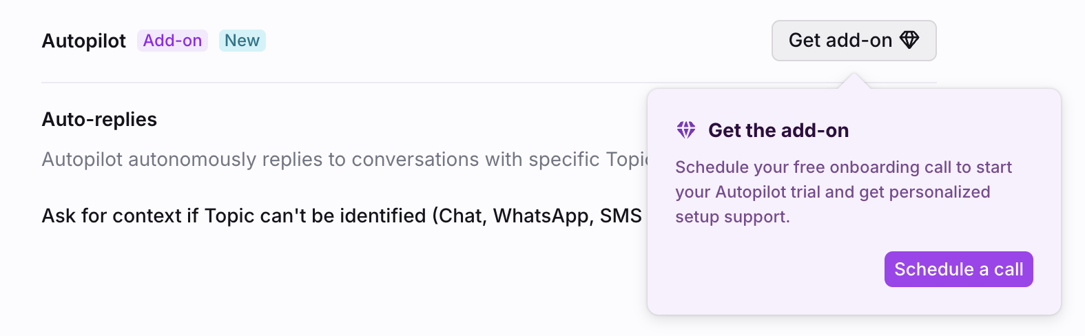 To try Autopilot for free, navigate to the Front AI page in your workspace settings, hover over the Get add-on button for Autopilot, then select Schedule a call.