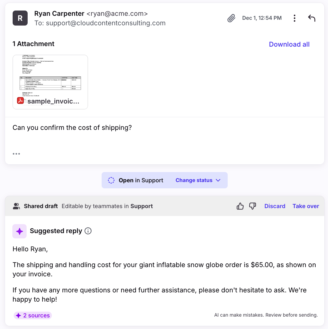 When a message contains a PDF attachment, Front AI will generate a summary of the content in the attachment. The summary is then used as additional context in AI-generated responses.