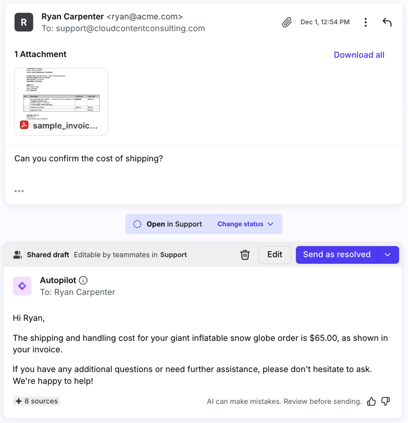 While Autopilot is loading, it identifies any similar conversations and relevant knowledge articles to help generate the reply.
