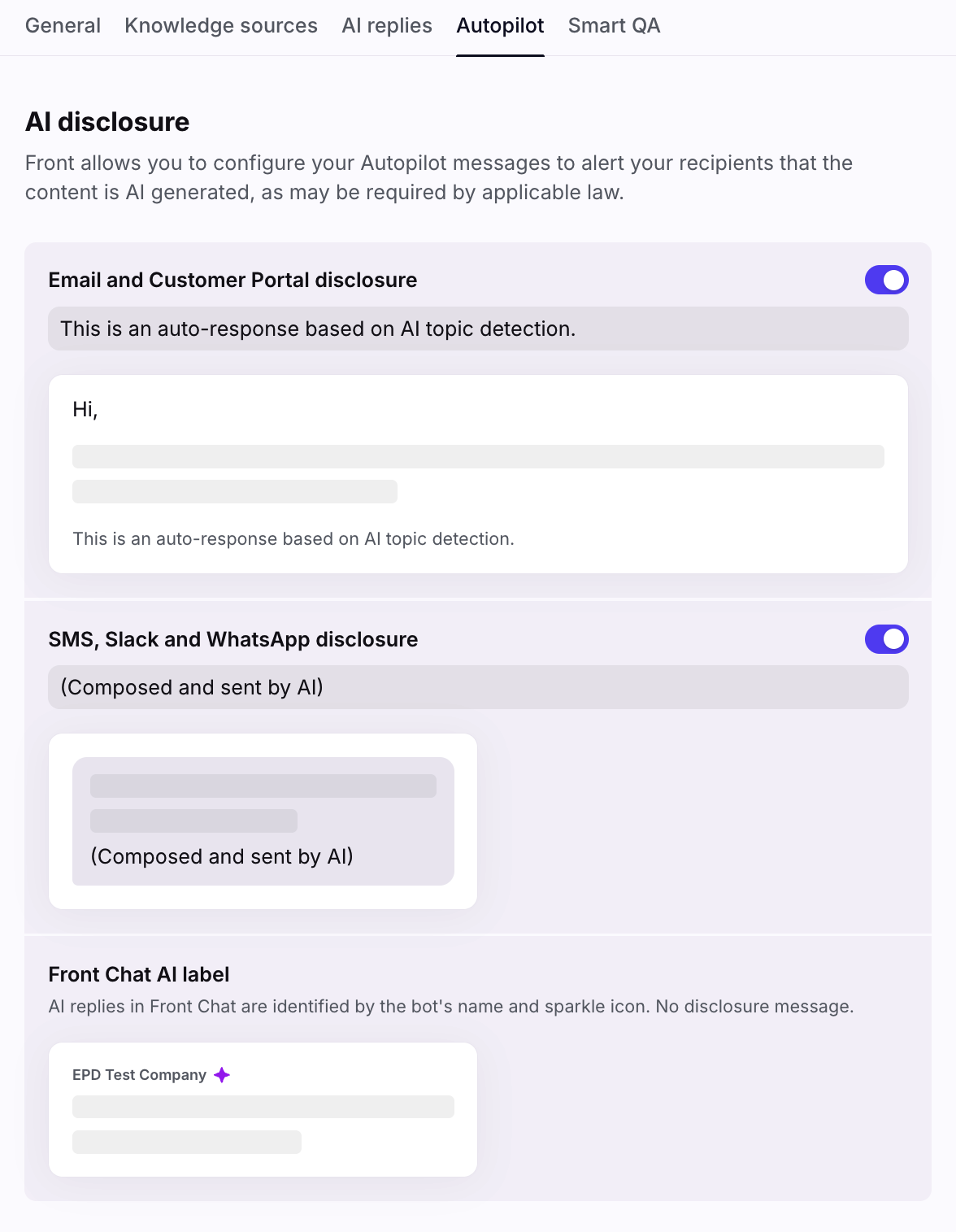 Select the Autopilot tab, then use the text fields to adjust the language in your AI disclosures for the supported channel types.