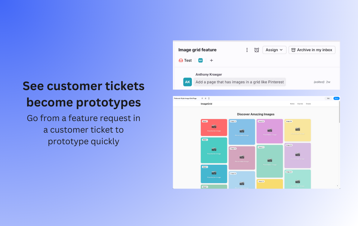 You can turn feature requests from customer tickets/conversations in Front into lifelike prototypes via Alloy. Using your existing product pages and design system, you can quickly create high-fidelity flows that reflect the requested change, then share the prototype back with your team for review and validation.