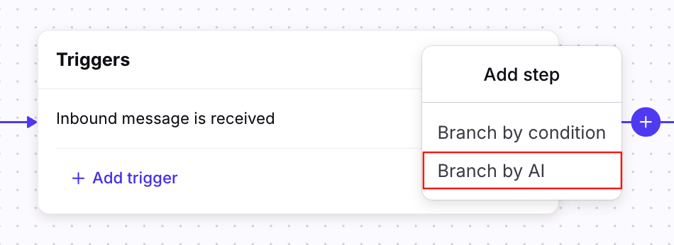 Navigate to the branching rule where you’d like to use this step. Click the plus sign (+), then select Branch by AI.
