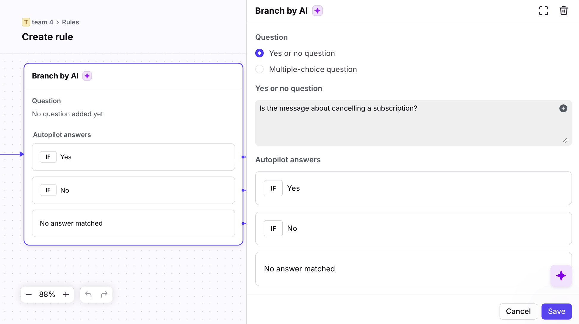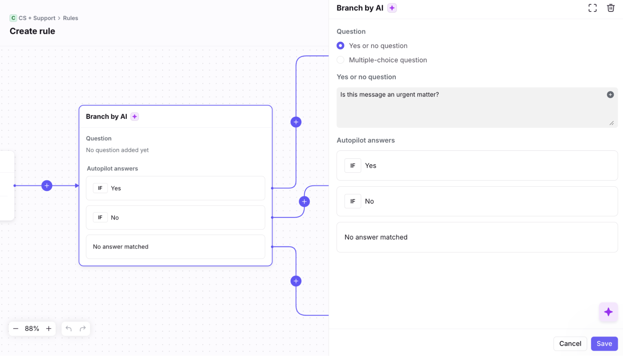 Use the Branch by AI step in branching rules to quickly triage conversations using natural language questions.