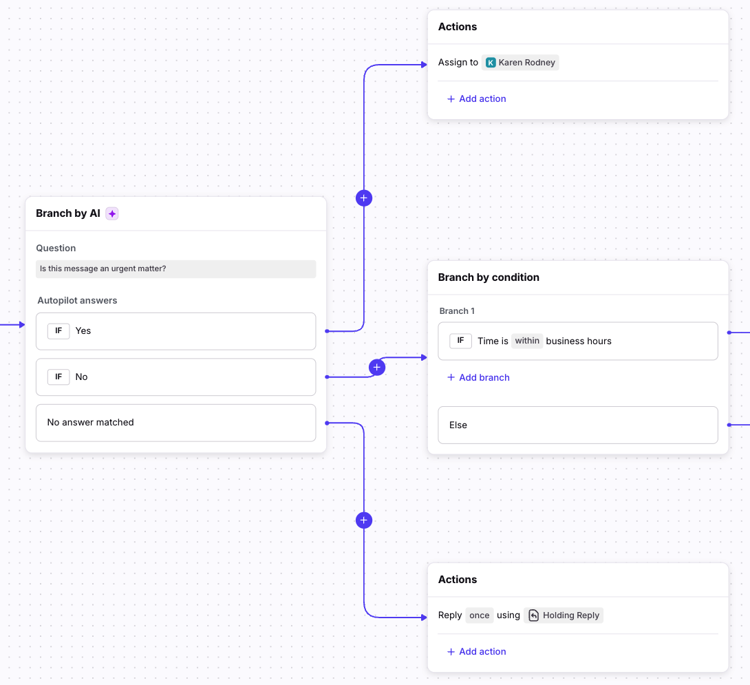 If AI cannot determine if the conversation is urgent or not, you can add another branch or action. In this example, if AI cannot determine the urgency of the conversation, we want to auto-reply with a message template.