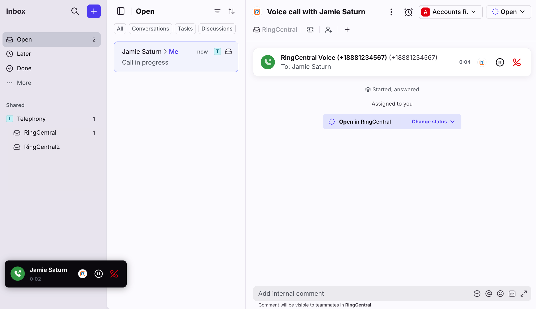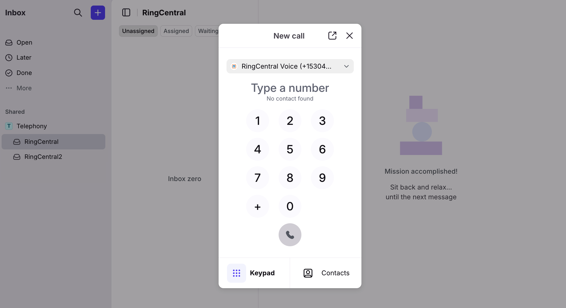 Once a Front admin has enabled the integration, agents can use RingCentral inside Front.