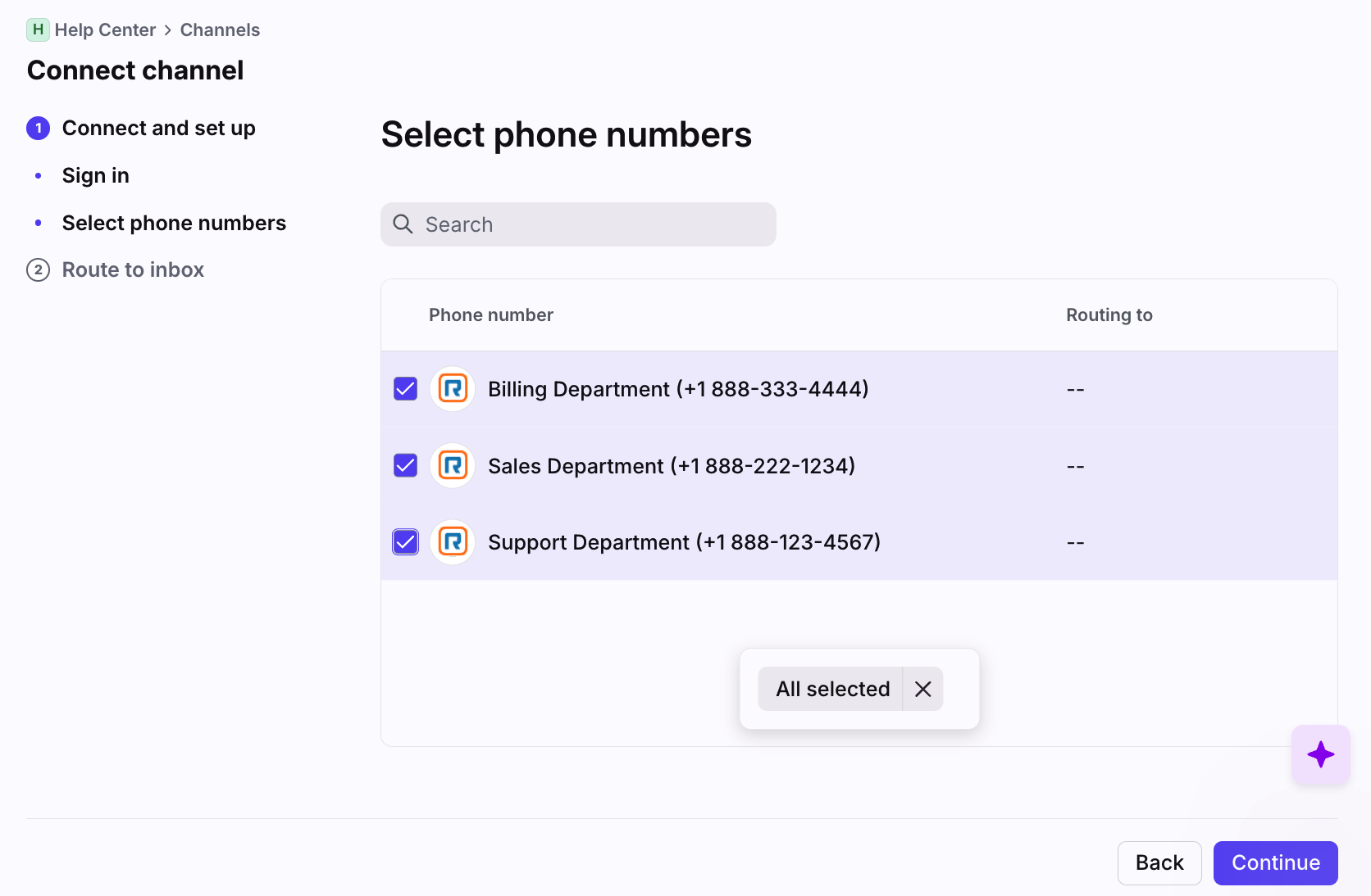 Click Continue to finish. All calls and messages from your channels will route to the selected inboxes by default.