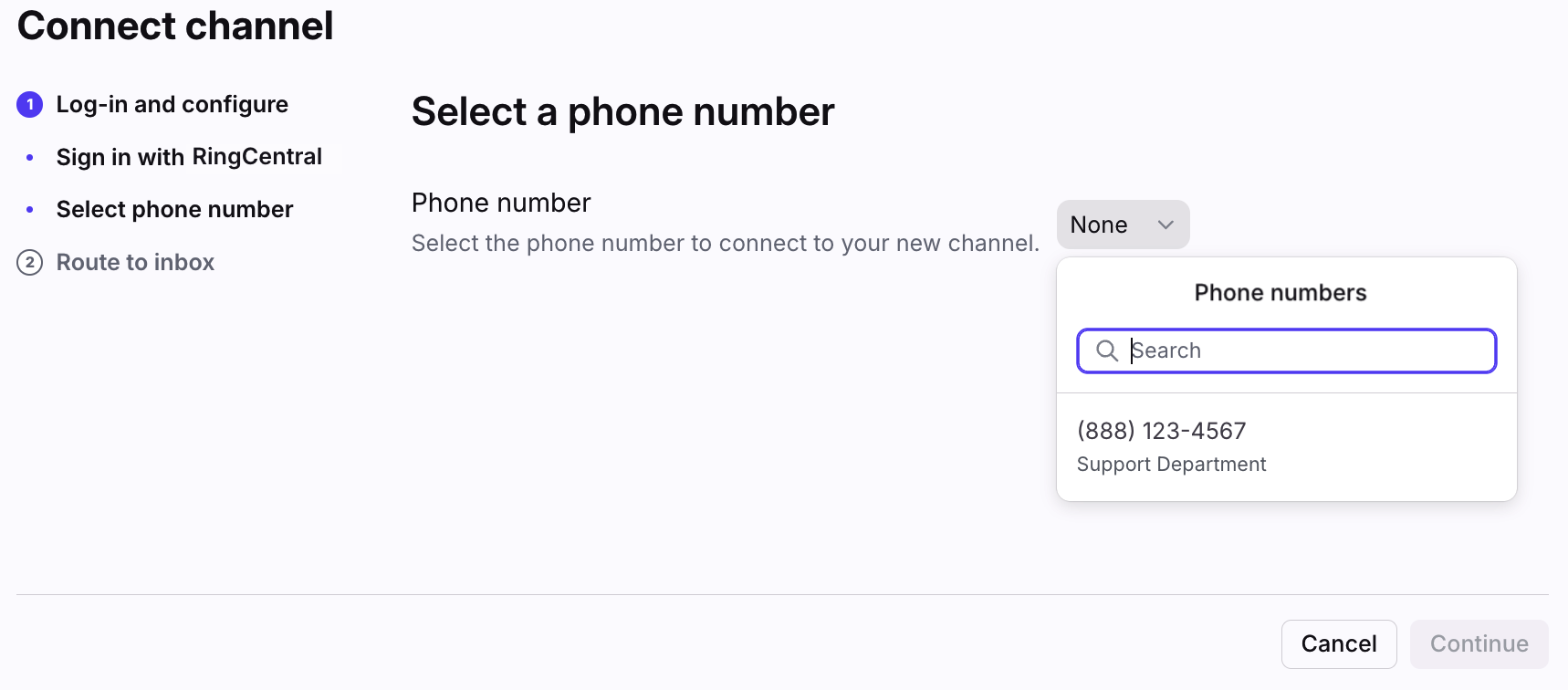 Select the inbox to connect to your channel. All calls and messages from your channel will route to this inbox by default. Click Continue to finish.