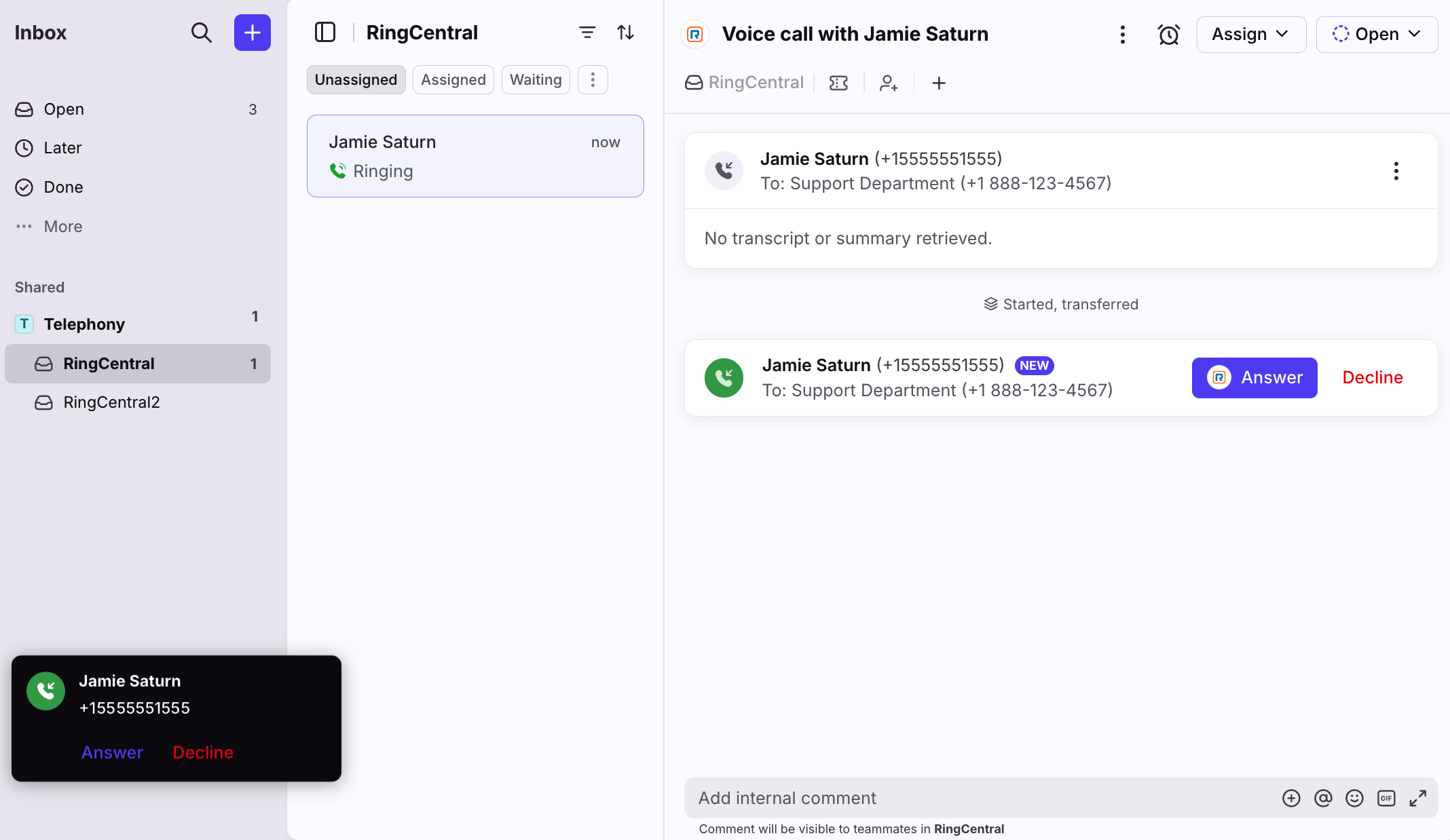 When there’s an incoming call, you’ll hear a ringtone and see a call widget pop-up at the bottom left. To answer the call, you can either click Answer in the call widget or conversation.