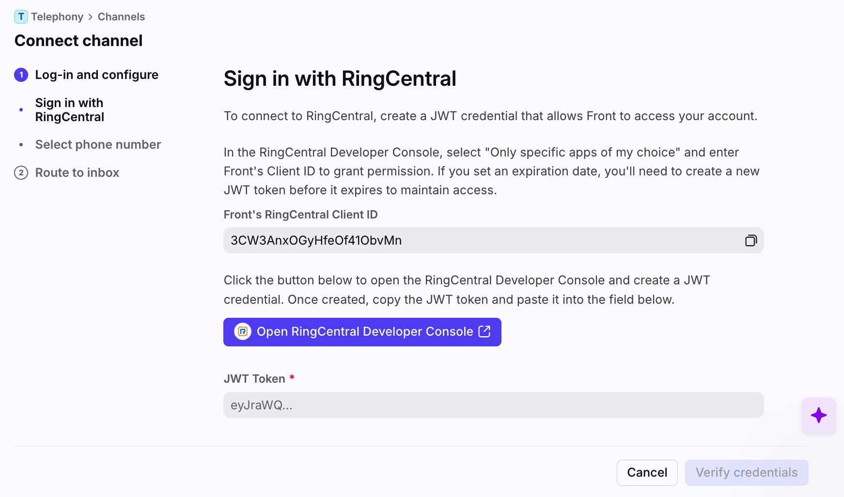 Copy Front’s RingCentral Client ID, then click the Open RingCentral Developer Console button to create a JWT credential to allow Front to access your RingCentral account.