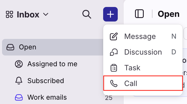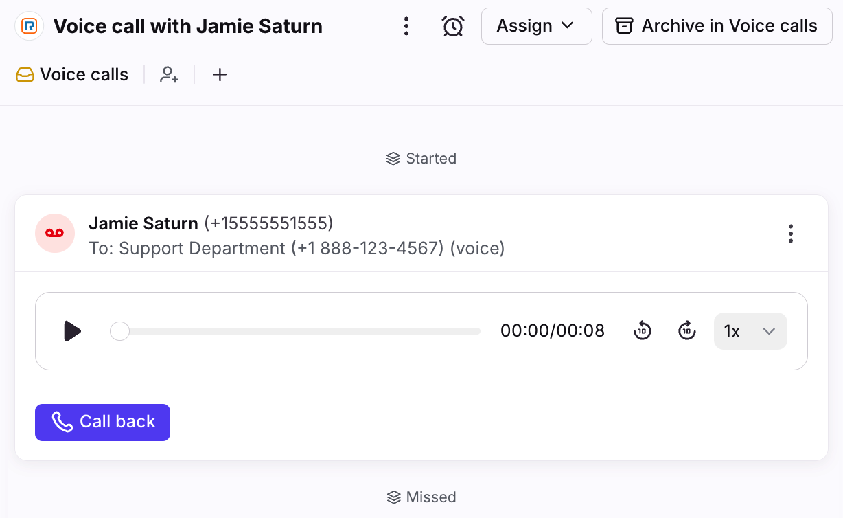 If no one is available to answer a call, a conversation will be created and marked as marked as Call missed or Voicemail in the conversation list.