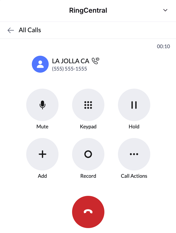 Click the RingCentral icon to expand the widget to take additional actions (mute, hold, etc.) using the toolbar icons. Use the arrow icon again to minimize the widget. You can always re-open it using the RingCentral icon in the conversation.