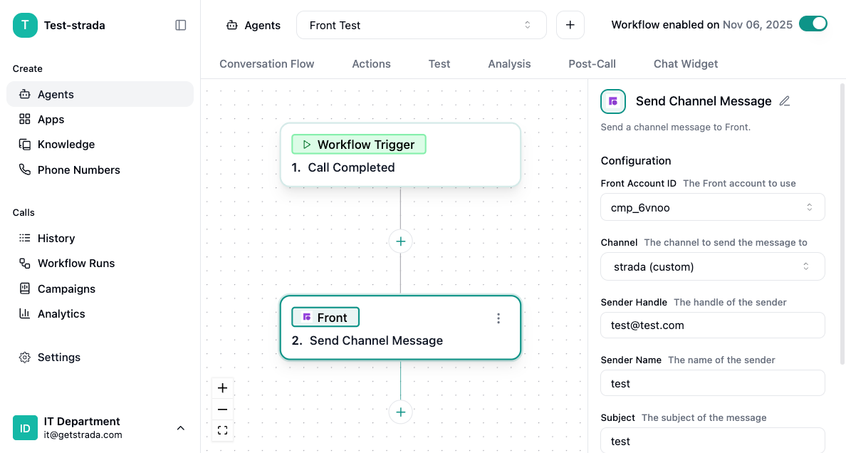 The Strada integration seamlessly connects your AI phone agents with Front's team inbox, enabling real-time visibility into call activities. During live calls, Strada automatically sends channel messages to keep your team informed of important customer interactions, escalations, or key conversation moments. After calls conclude, the integration triggers post-call workflows that route conversation summaries, action items, and follow-up tasks to the appropriate Front channels, ensuring nothing falls through the cracks and enabling smooth handoffs between AI agents and human team members.